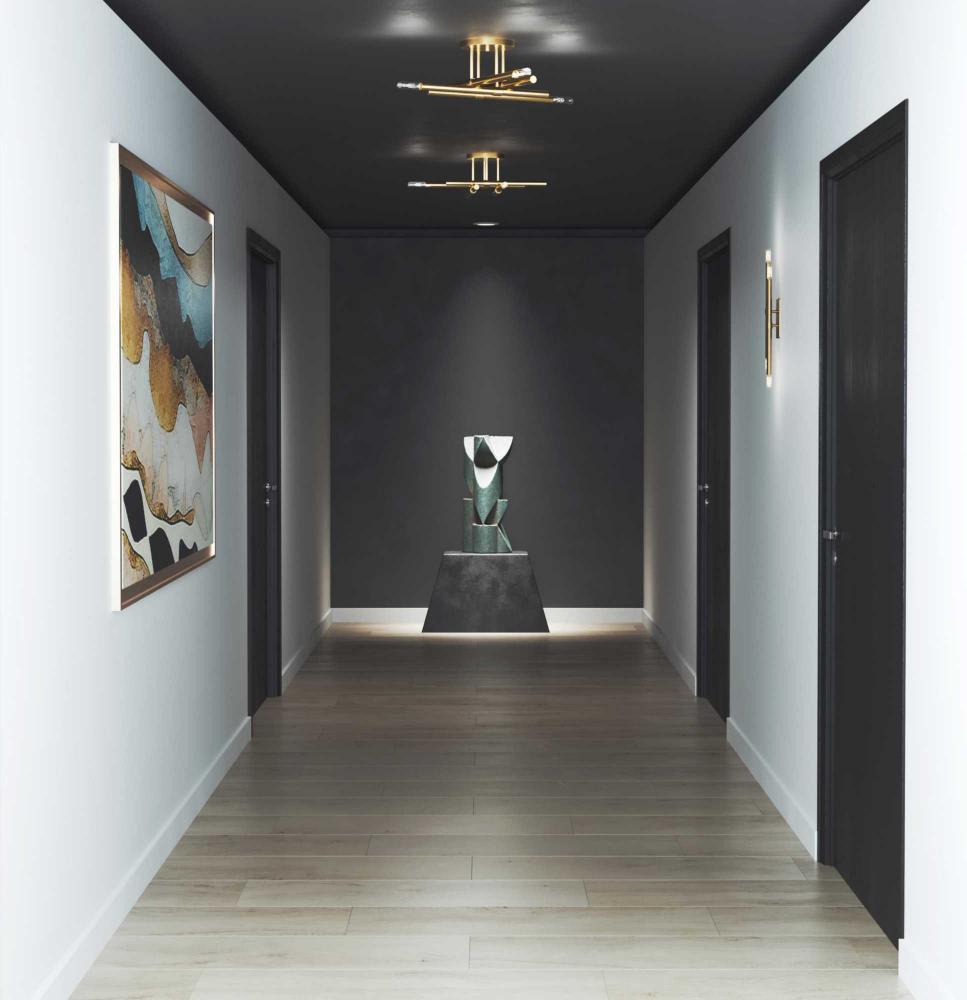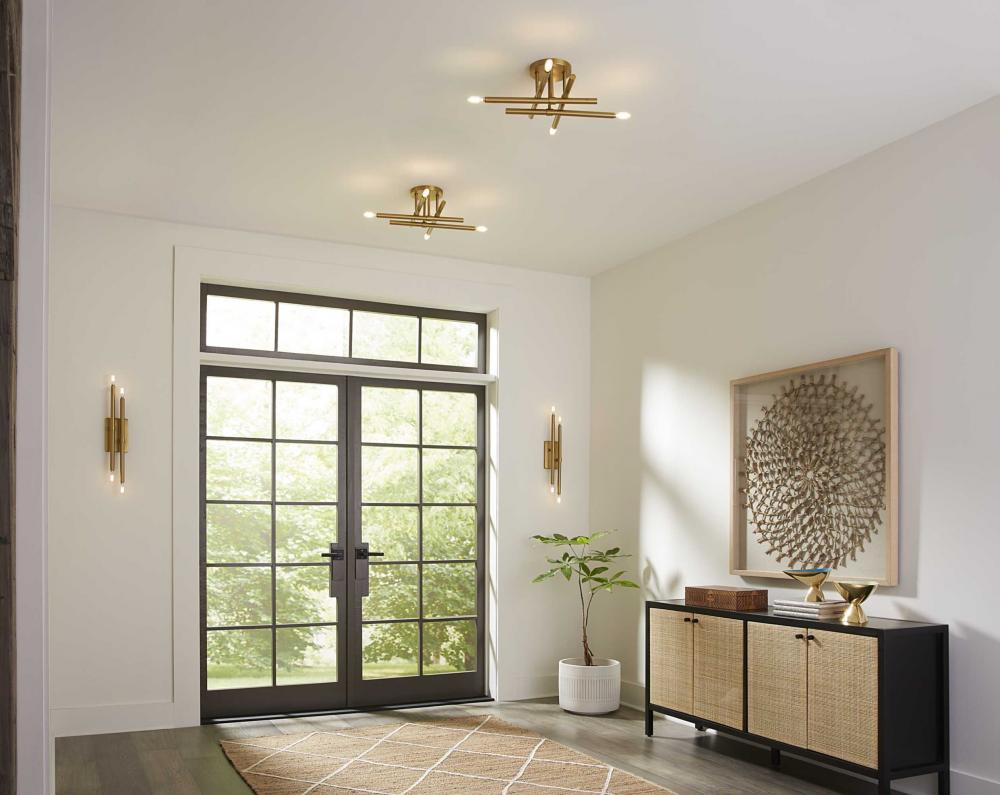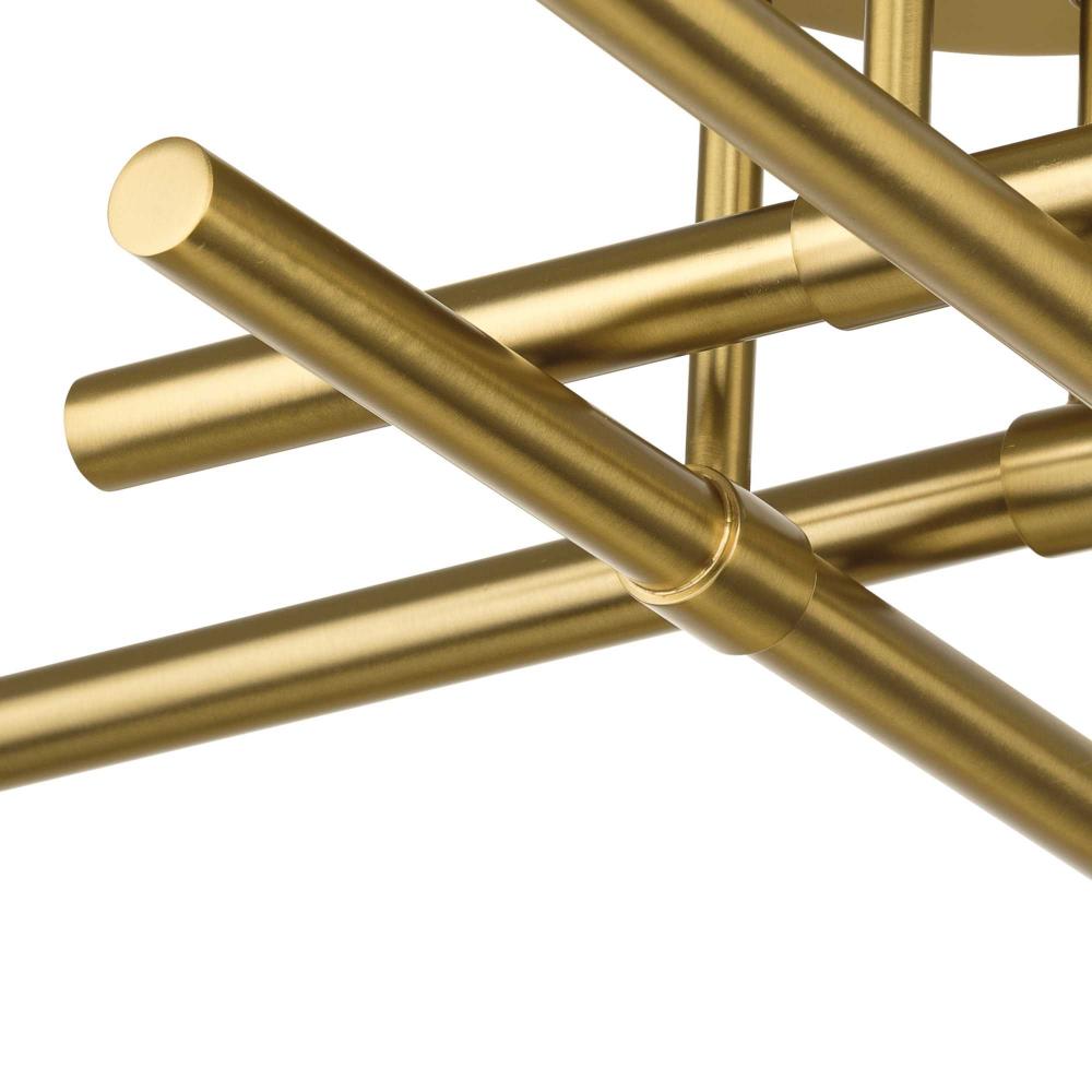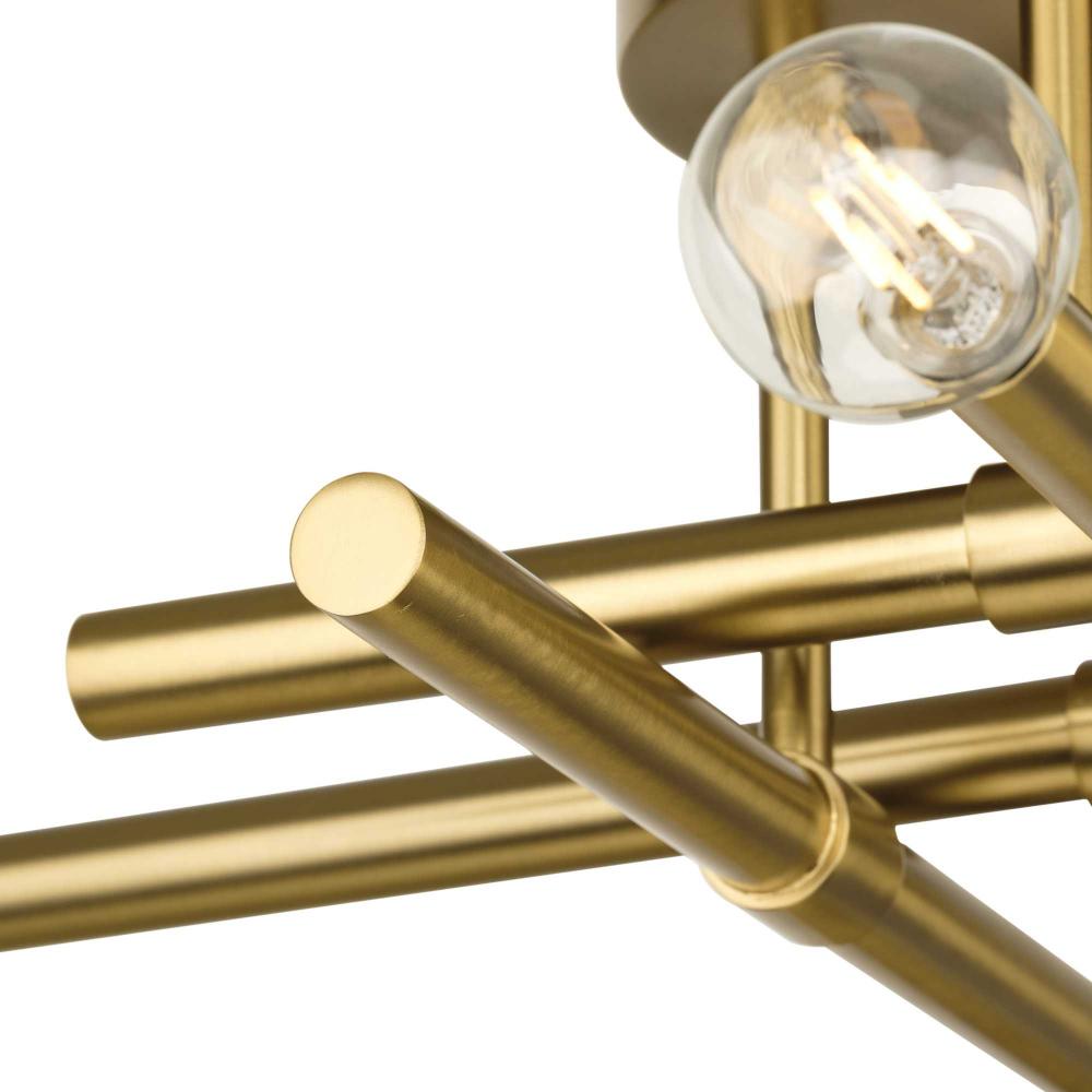 The Arya Collection has a lively essence created by the rhythm of slender, graceful features. The style offers modern appeal with understated elegance.Staggered arms coated in a soft brushed gold are suspended from a central axis, defining this bold architectural form. The semi-flush mount light brings a modern flair to ceilings in bedrooms, halls and home theaters and living rooms in luxe, mid-century modern and contemporary settings. This fixture is part of the Progress Lighting Design Series, a lighting collection offering fashionable styles and affordable luxury lighting for the home.