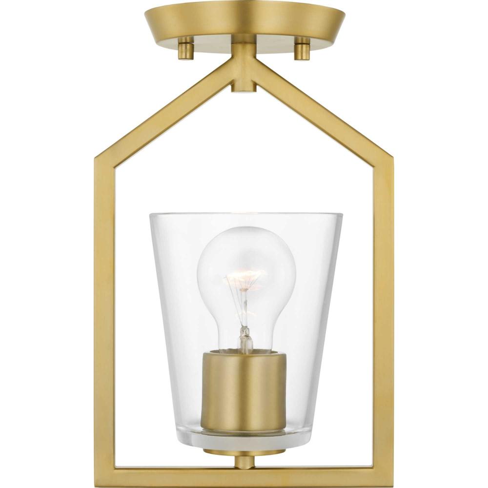 Elegantly extended, the Vertex semi-flush mount is composed of angular forms to create a bold design that perfectly complements halls, foyers and kitchens in modern interiors. Its distinctive silhouette is coated in a brushed gold finish. A clear glass shade offers bright illumination to spaces below.