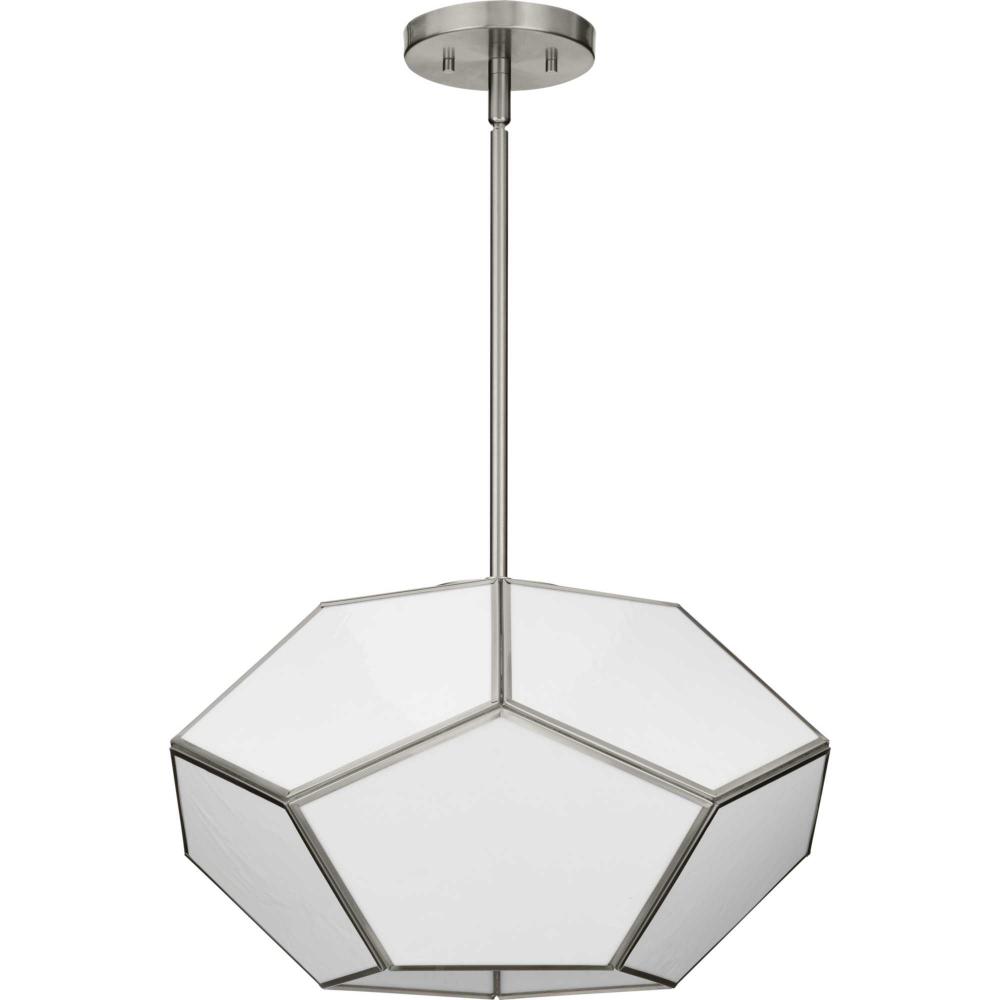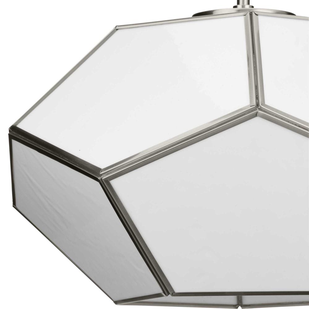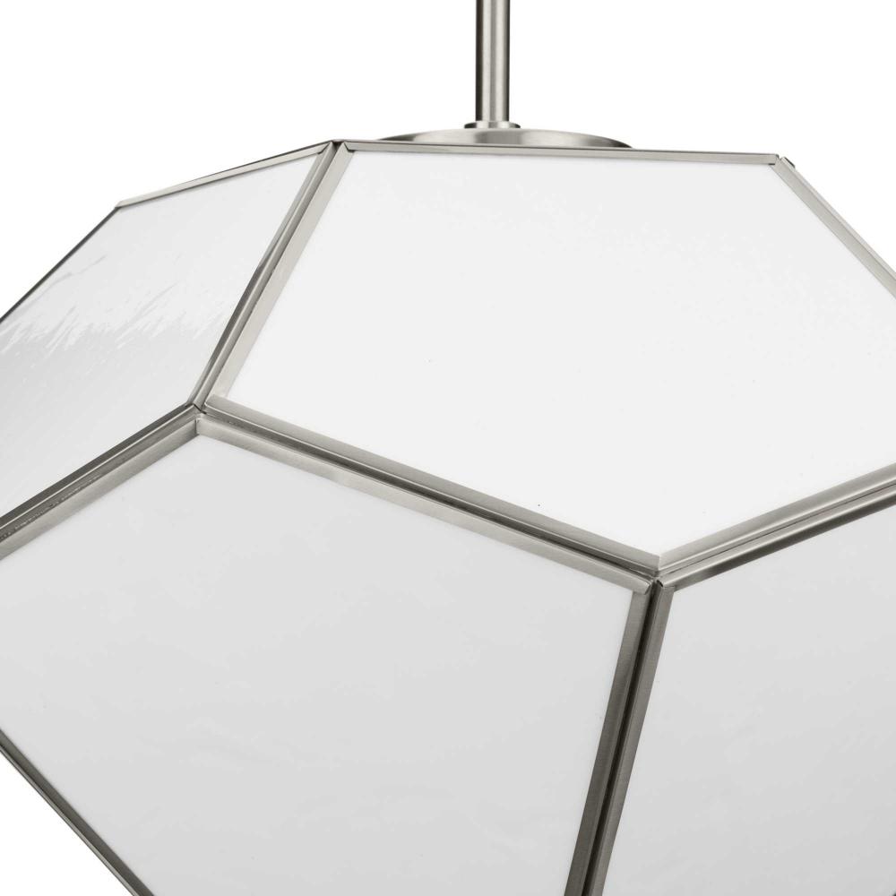 Charmingly distinctive, the Latham Collection glows from within. The large light is composed of a geometric framework finished in Brushed Nickel that features an artful array of handmade white art glass. This versatile fixture can be mounted as a semi-flush mount or as a pendant. Inspired as a modern expression of an origami lantern, the light delivers striking illumination to spaces below.