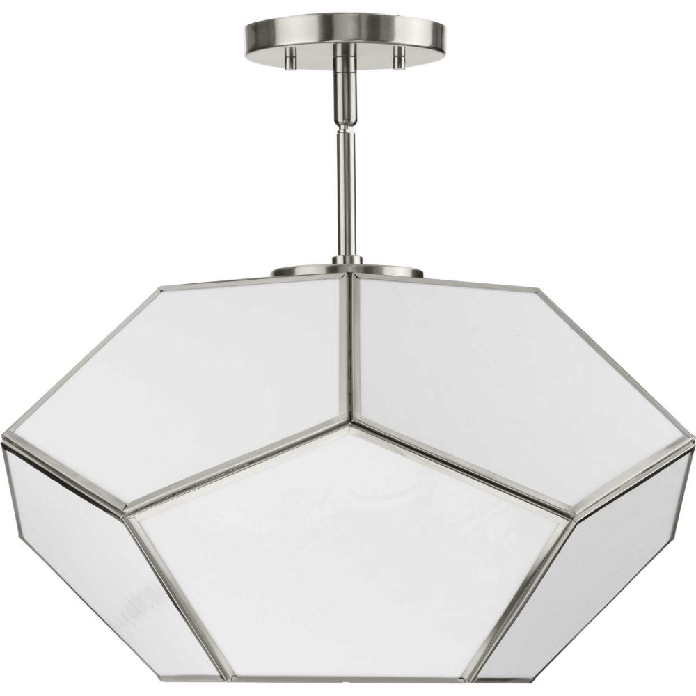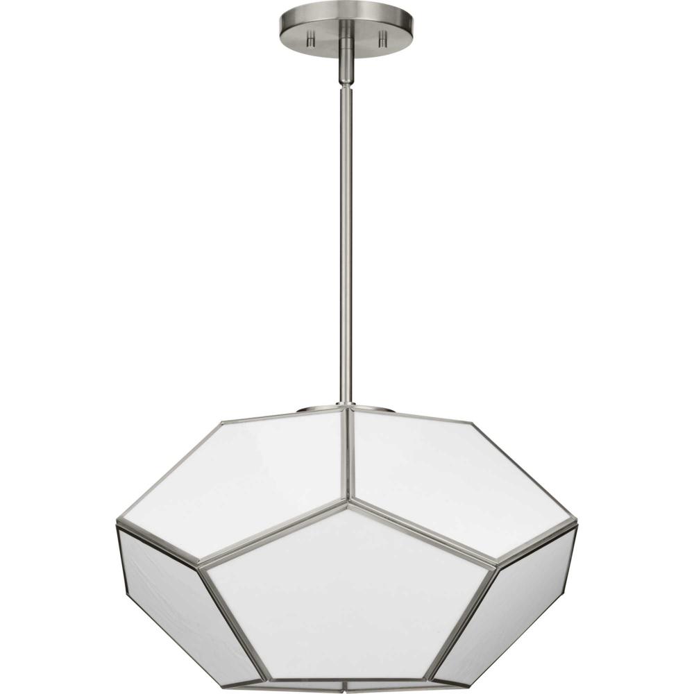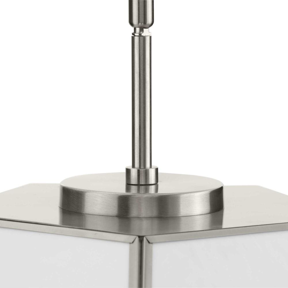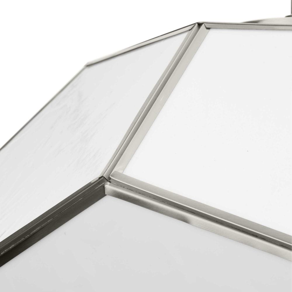 Charmingly distinctive, the Latham Collection glows from within. The large light is composed of a geometric framework finished in Brushed Nickel that features an artful array of handmade white art glass. This versatile fixture can be mounted as a semi-flush mount or as a pendant. Inspired as a modern expression of an origami lantern, the light delivers striking illumination to spaces below.
