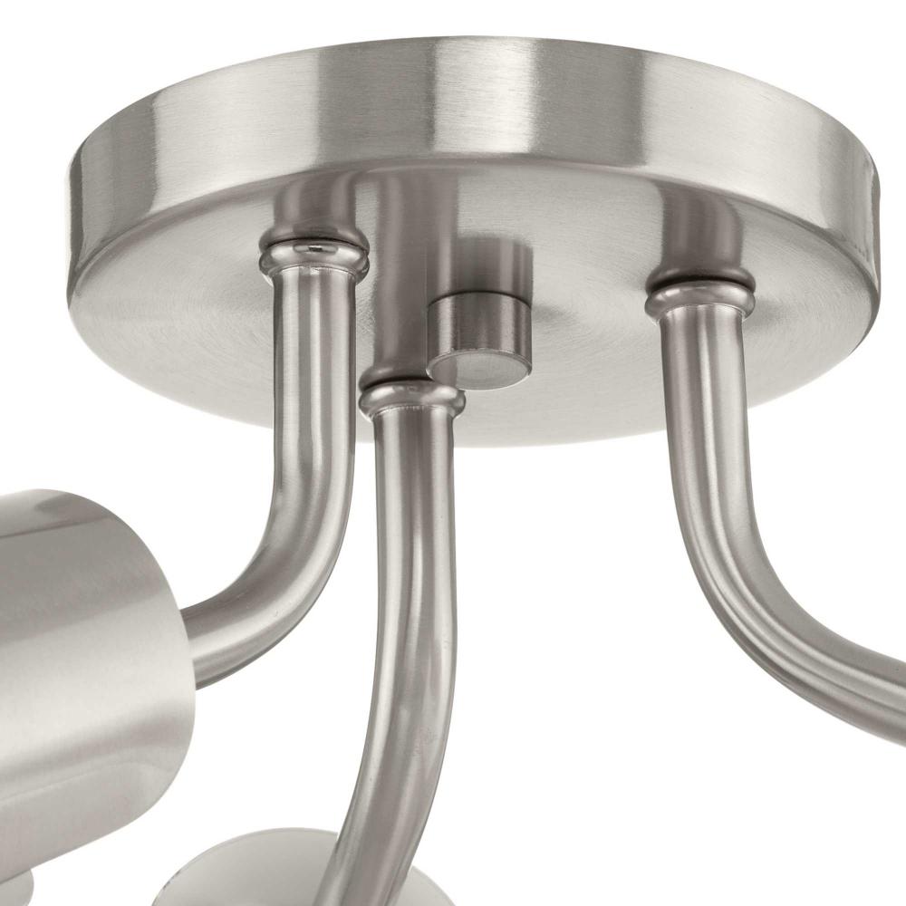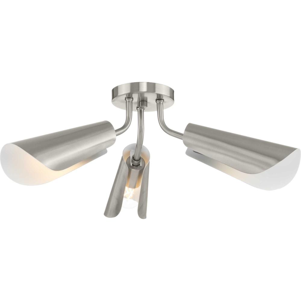 Cornett trumpets its arrival on the scene with a blending of timeless modern design. The Close-to-Ceiling fixture features dynamic angles finished in Brushed Nickel, offering a dramatic counterpoint to the softly sculpted curves of the matching metal reflector shades.Light is directed out and downwards from its unique, curved construction.