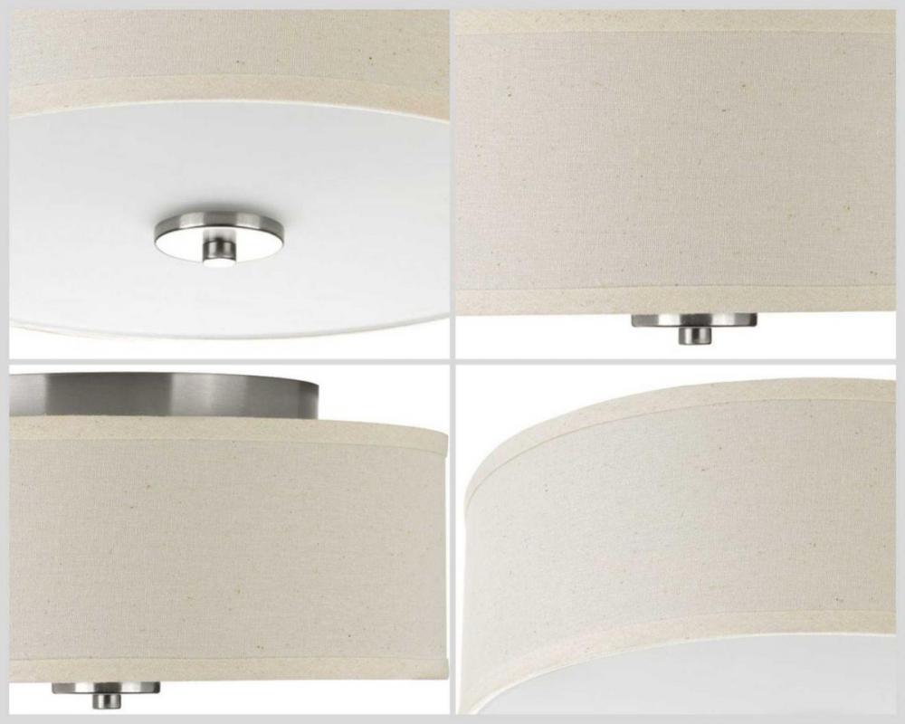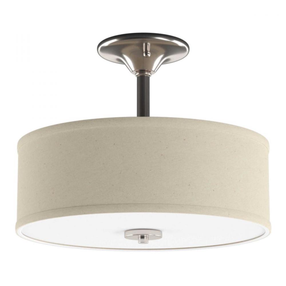 Harkening back to a simpler time, the Inspire Collection semi-flush mount ceiling light freshens traditional forms with clean lines. The two-light brushed nickel semi-flush mount features an etched glass diffuser with an off-white linen shade. This fixture is suitable for a variety of design styles, including transitional, traditional and farmhouse and the simple design is a perfect for a variety of locations throughout the home.
