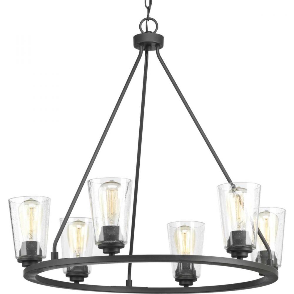 A new category of vintage modern fixtures takes center stage with this six-light chandelier from one of our Design Series collections. Delicate details in a Graphite finish, create statement making focal pieces for a variety of interiors. Debut provides a fitting stage to feature nostalgic, vintage lamps. Glass accessory shades available in clear or frosted seeded finishes.