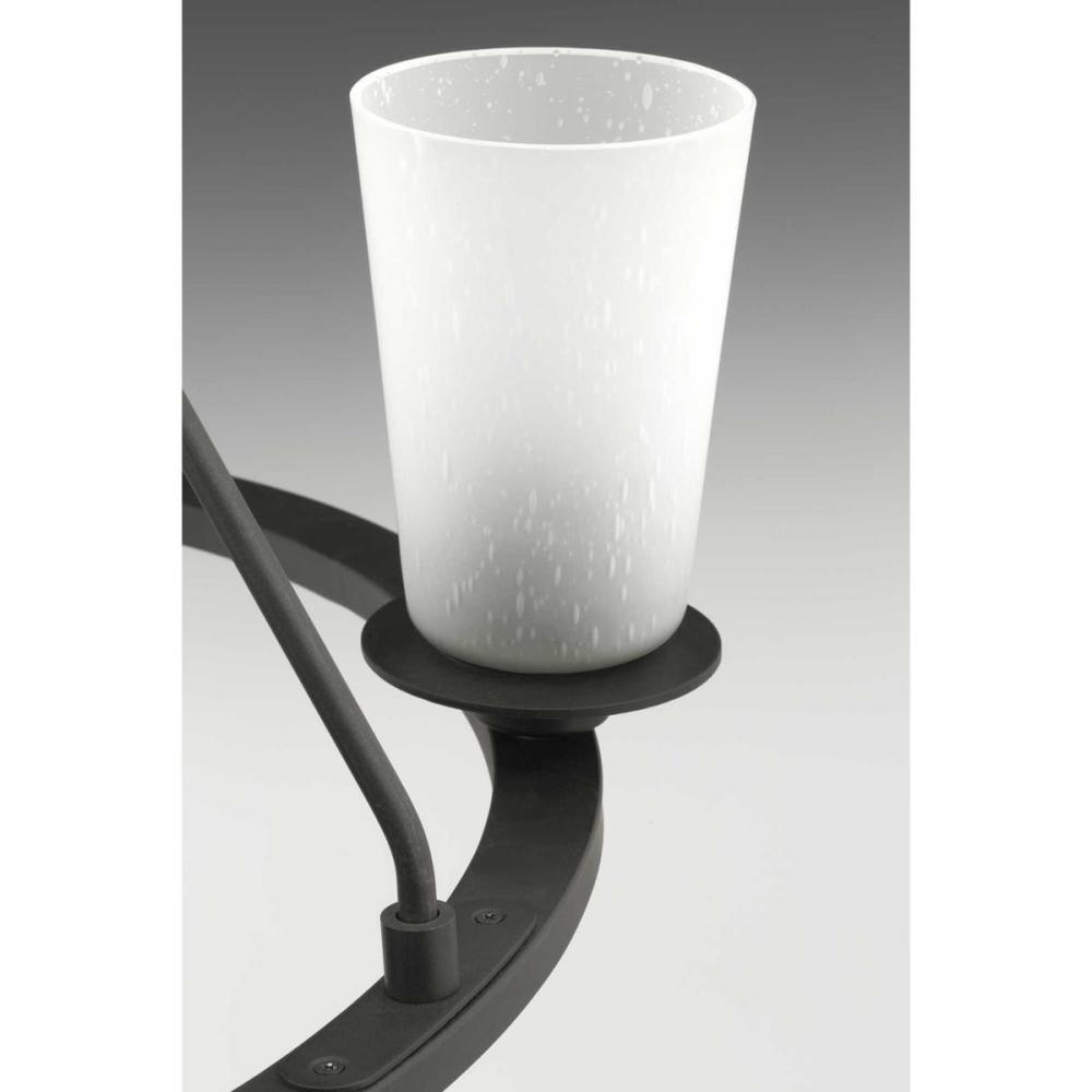 Graphite finish.;A uniquely vintage modern feel.;Delicate details with a warm finish.;Makes a great statement piece for a variety of interiors.;Glass accessory shades in clear (P860003-001) or frosted (P860002-001) seeded finishes are available.