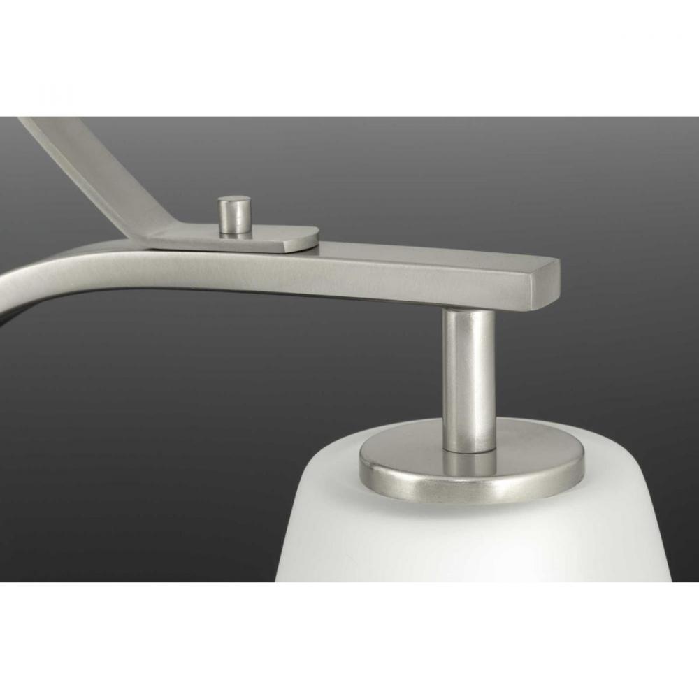 Brushed Nickel finish.;Sweeping arcs frame tapered etched shades.;Glass shades large in scale.;Contemporary design.;6" stem with loop attaches to chain.