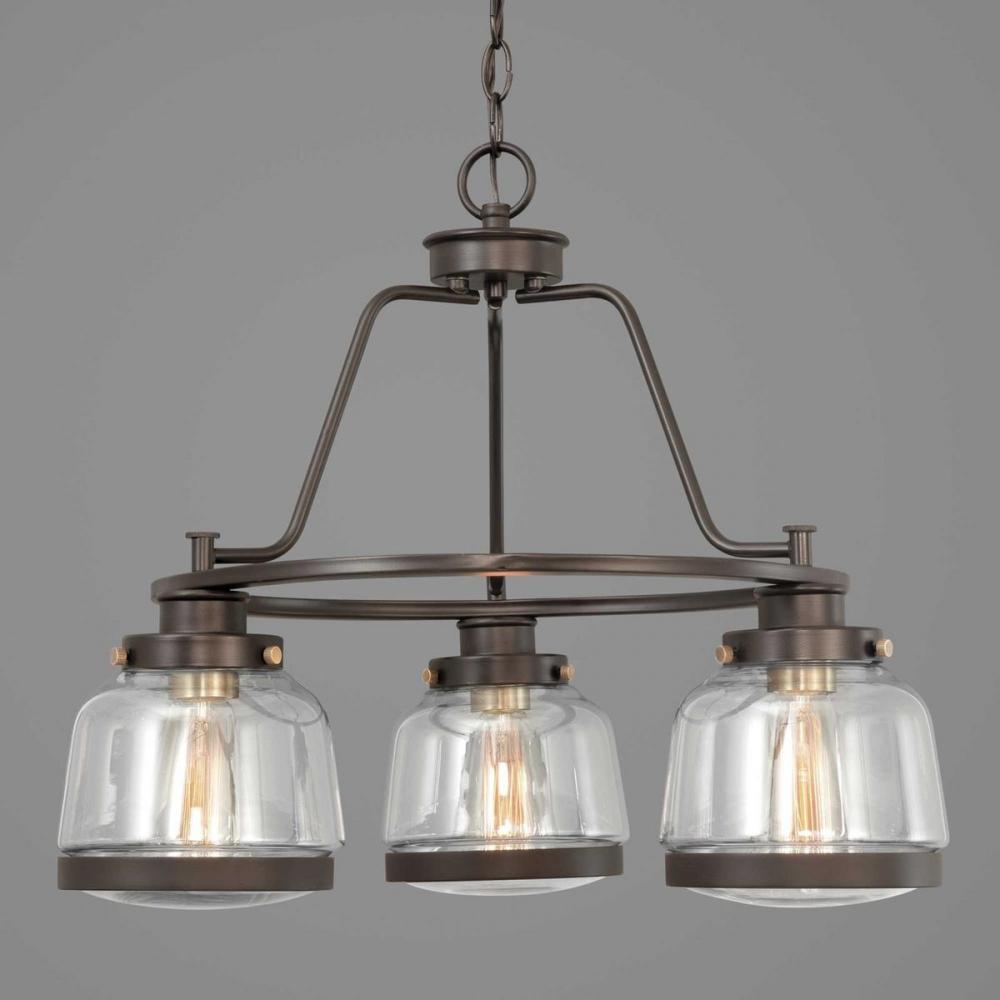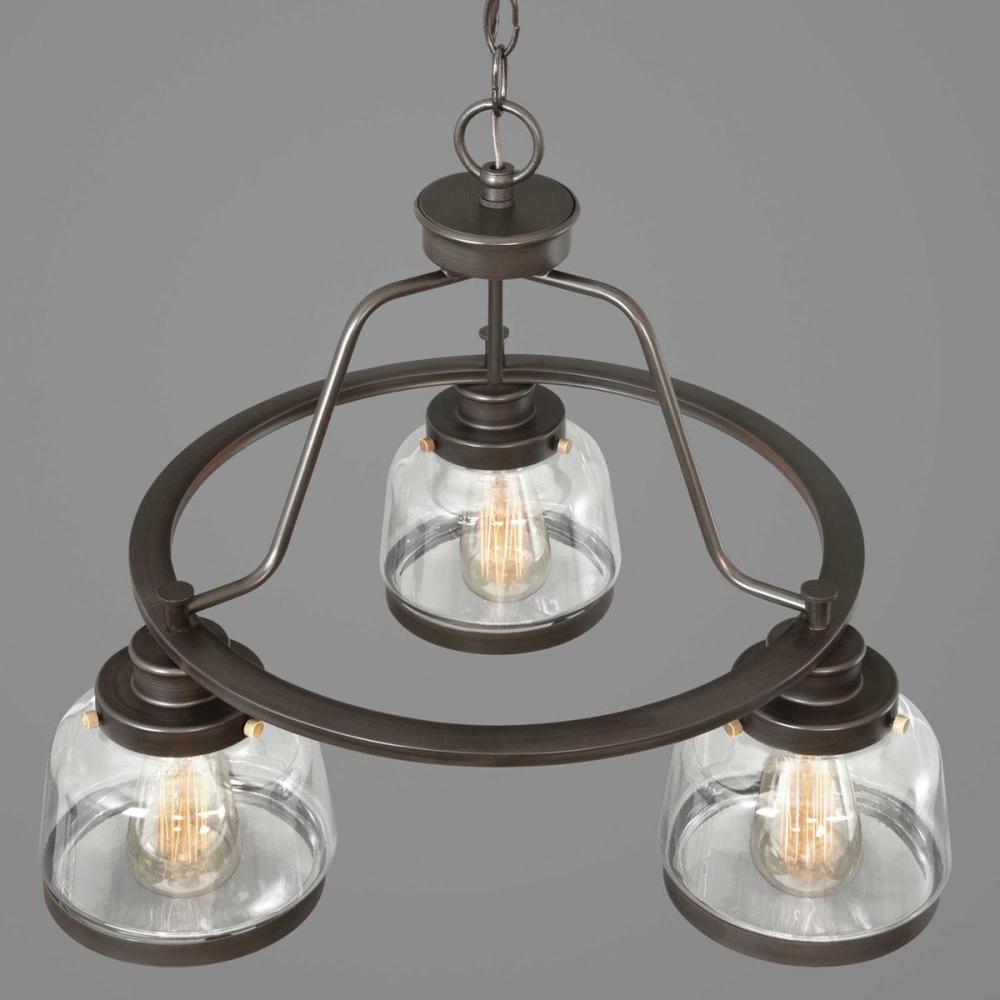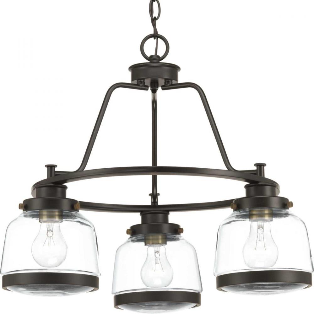 The Judson collection features a timeless clear schoolhouse-style globe. Metal fittings add distinction to complete the vintage look. Judson provides the perfect compliment to farmhouse or coastal-inspired homes. Three-light chandelier in an Antique Bronze finish.