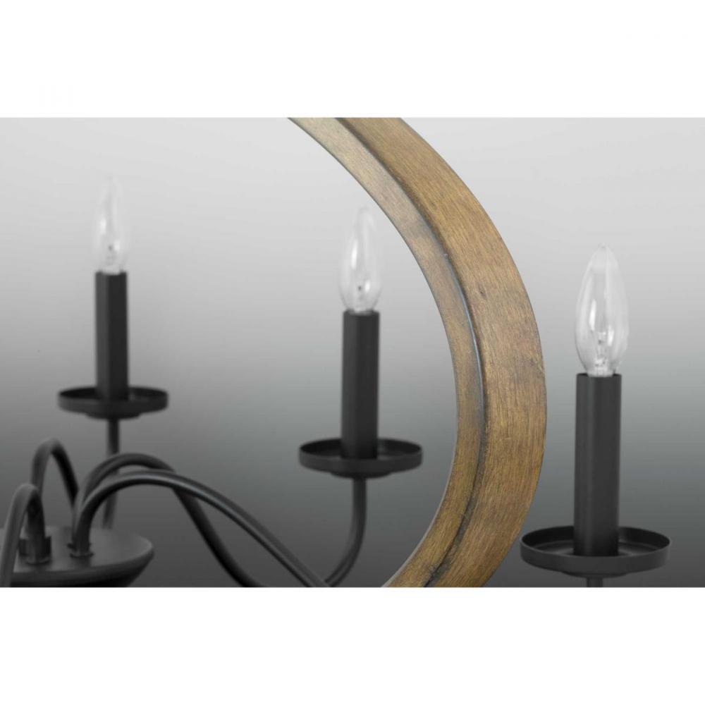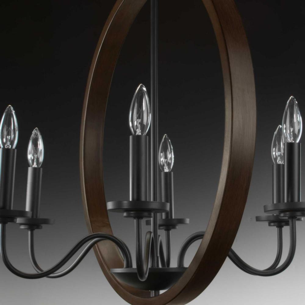 Features updated designs that honor the charm of early American styling;Dramatic circular frame offers a stylish perch for graceful candelabra lights;Dual tone finish combination is Antique Bronze with hand painted weather oak accents;Uses six 60 watt max.