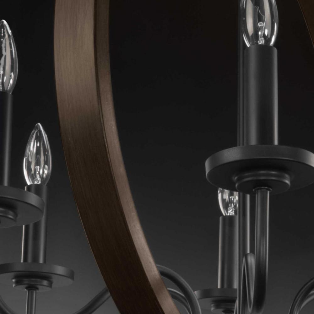 With updated designs that honor the charm of early American styling, Fontayne six-light chandelier provides a timeless elegance to Rustic Farmhouse, Modern Farmhouse and Urban Industrial spaces. Impressive graphic elements take center stage, while candelabra lights highlight subtle curves. Dual tone finish combinations of Antique Bronze with faux oak accents.