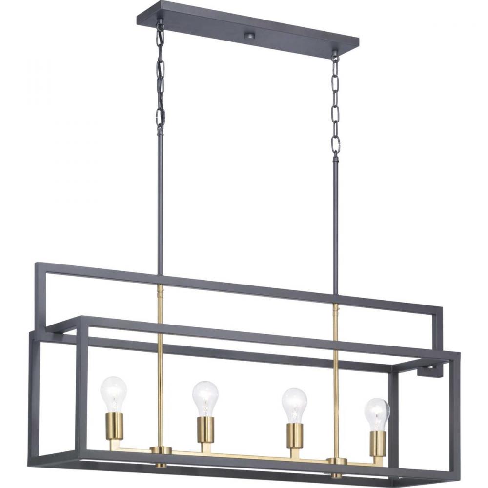 The Blakely collection four-light linear chandelier is a fashion-forward design style. A rectangular frame celebrates geometric interplay with clean, straight lines. Finished in Graphite with satin brass accents, the Blakely collection is ideal for Modern and Traditional interiors.