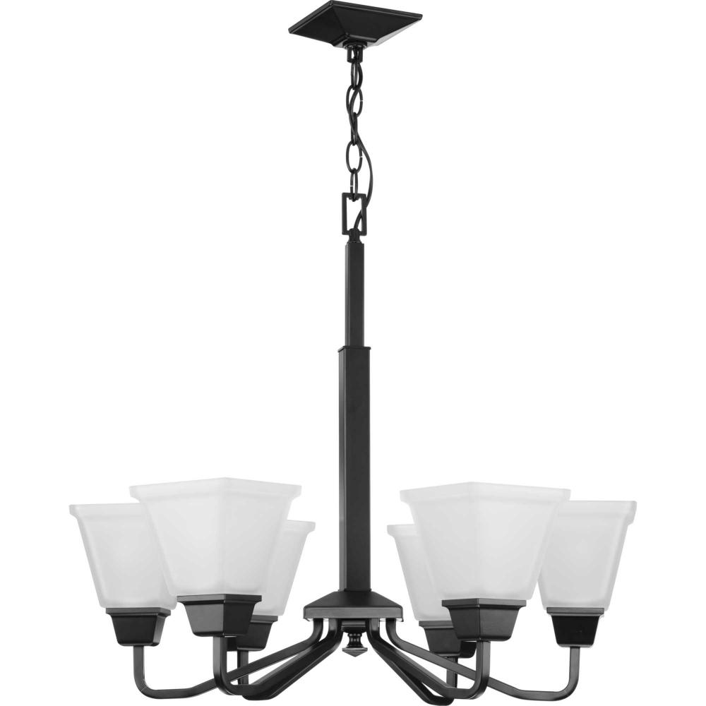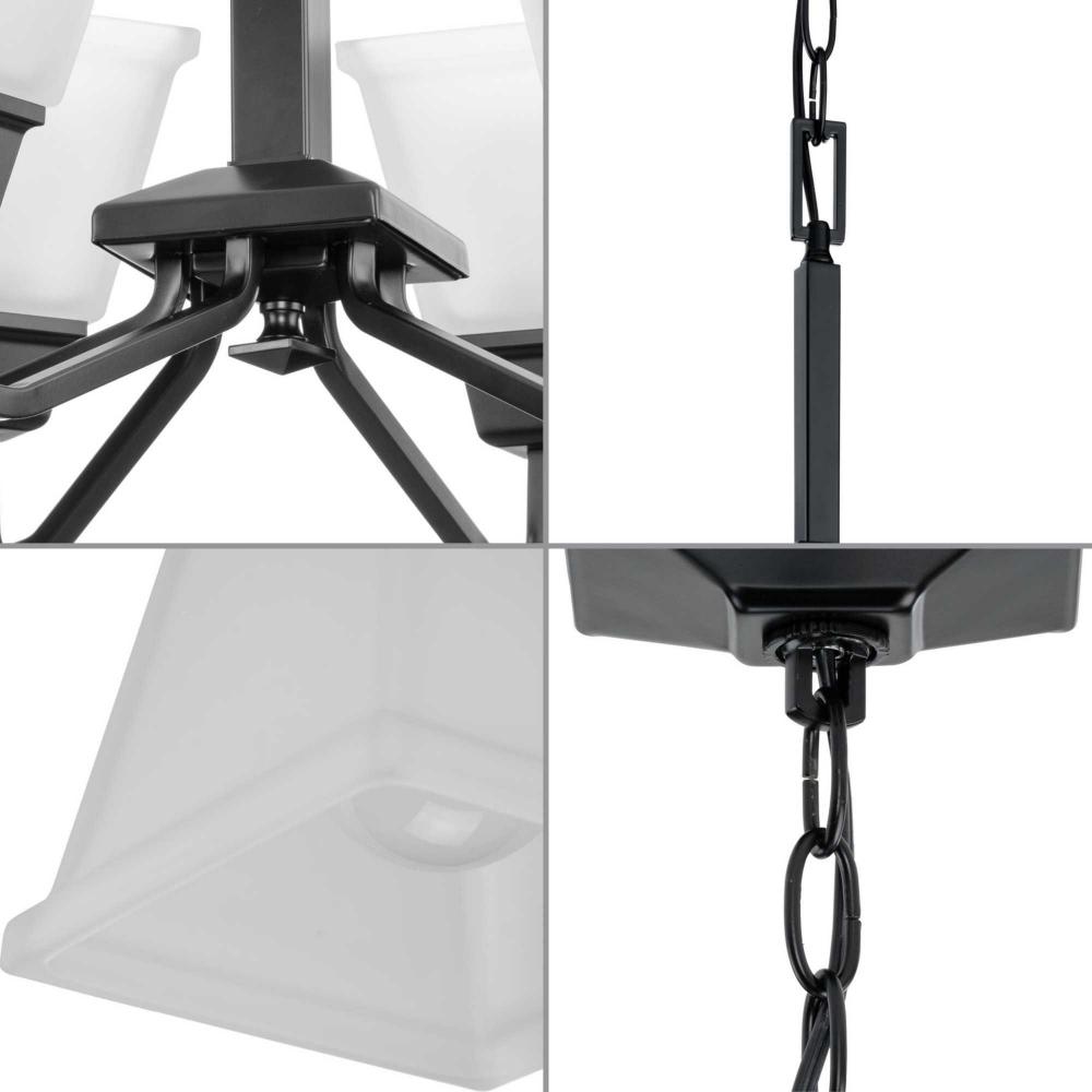 Distinctive forms and clean lines create a chandelier with an enduring style perfect for dining rooms and breakfast nooks;Inspired by craftsman styling, the chandelier has a substantial design ideal for modern farmhouse interiors;Elegant etched glass shade