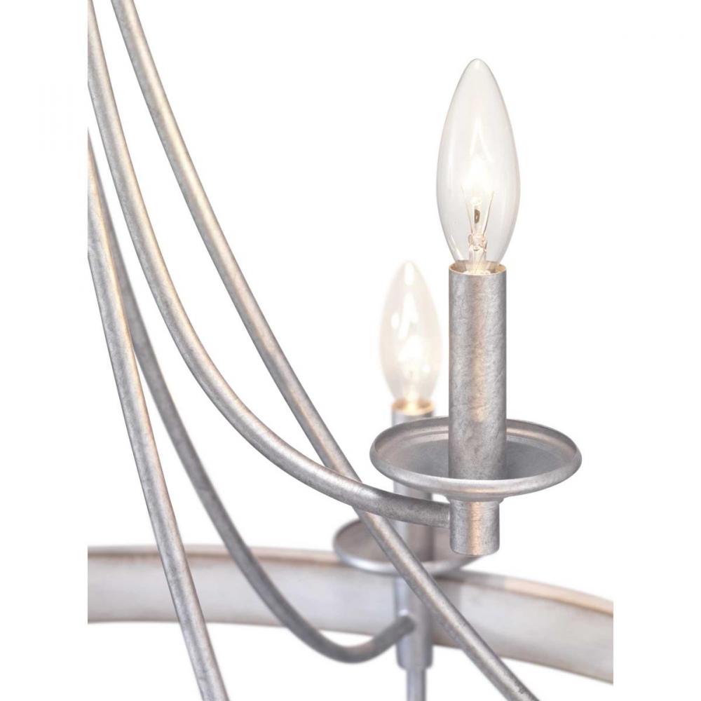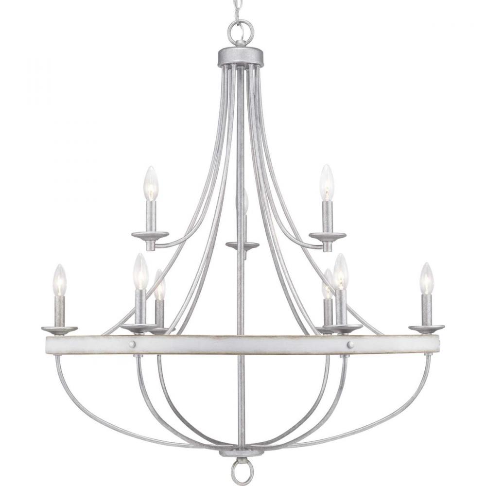 The nine-light chandelier in the Gulliver Collection features arching and delicate details that curve to create an airy design. Dual toned frame color combinations in a Galvanized finish with antique white accents The hand painted wood grained texture finished to emulate weathered driftwood complements Rustic and Modern Farmhouse home decor, as well as Urban Industrial and Coastal interior settings.
