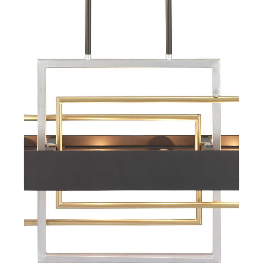 An array of geometric patterns in Adagio six-light linear chandelier is a nod to the musical description of a tender and melodic tone. The modern design features lights that are distributed around a circular Black band. Mixed metal elements, which are present in Brushed Silver and Brushed Brass accents, can complement monochromatic color palettes that are popular in homes today. Each fixture in the Adagio collection creates a focal point and is ideal for Luxe and Modern interiors.