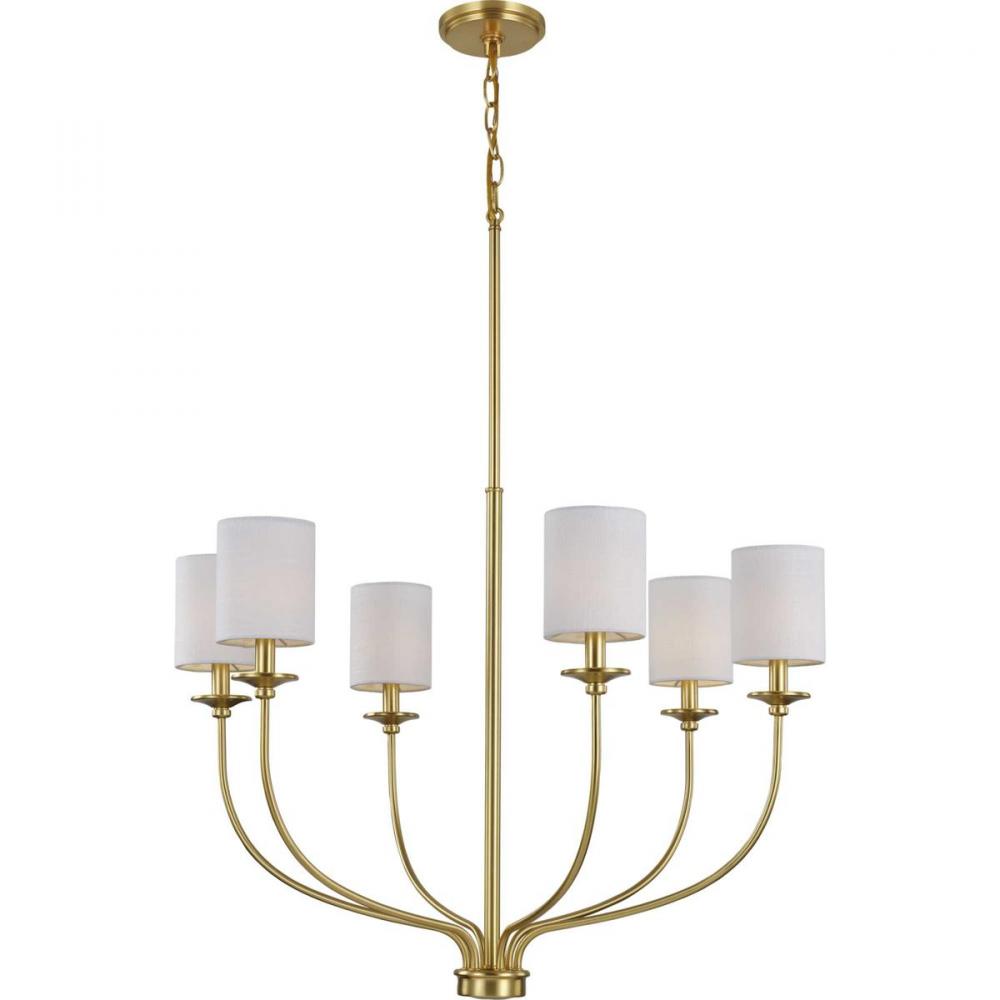 Inspired at its roots by an understated beauty and a breathtaking formal elegance, the Bonita Collection Six-Light Satin Brass Foyer Chandelier will make a stunning addition to any luxurious living space. Narrow drum shades circle the structure's center as they are held in place by golden candlestick light bases supported by elegantly curved arms. A round, shiny base serves as a decorative foundation for the light fixture.