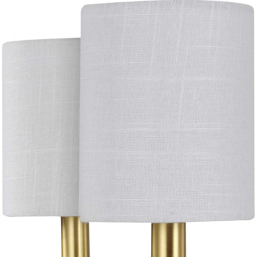 Round, shiny base serves as a decorative base for the foyer light.;Handsome satin brass central column stretches from the light fixture's base to the ceiling.;Golden candlestick light bases supported by elegantly curved arms hold the drum shades in pla