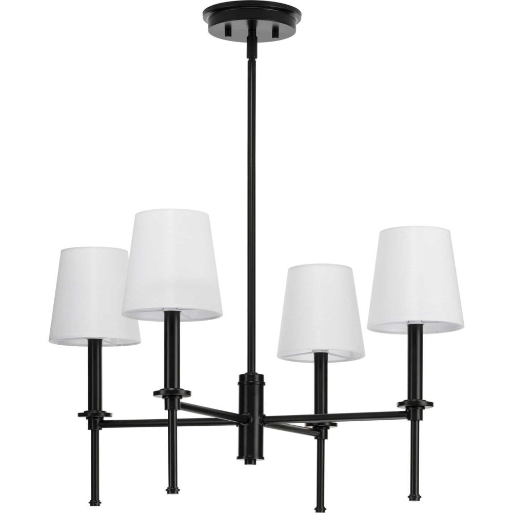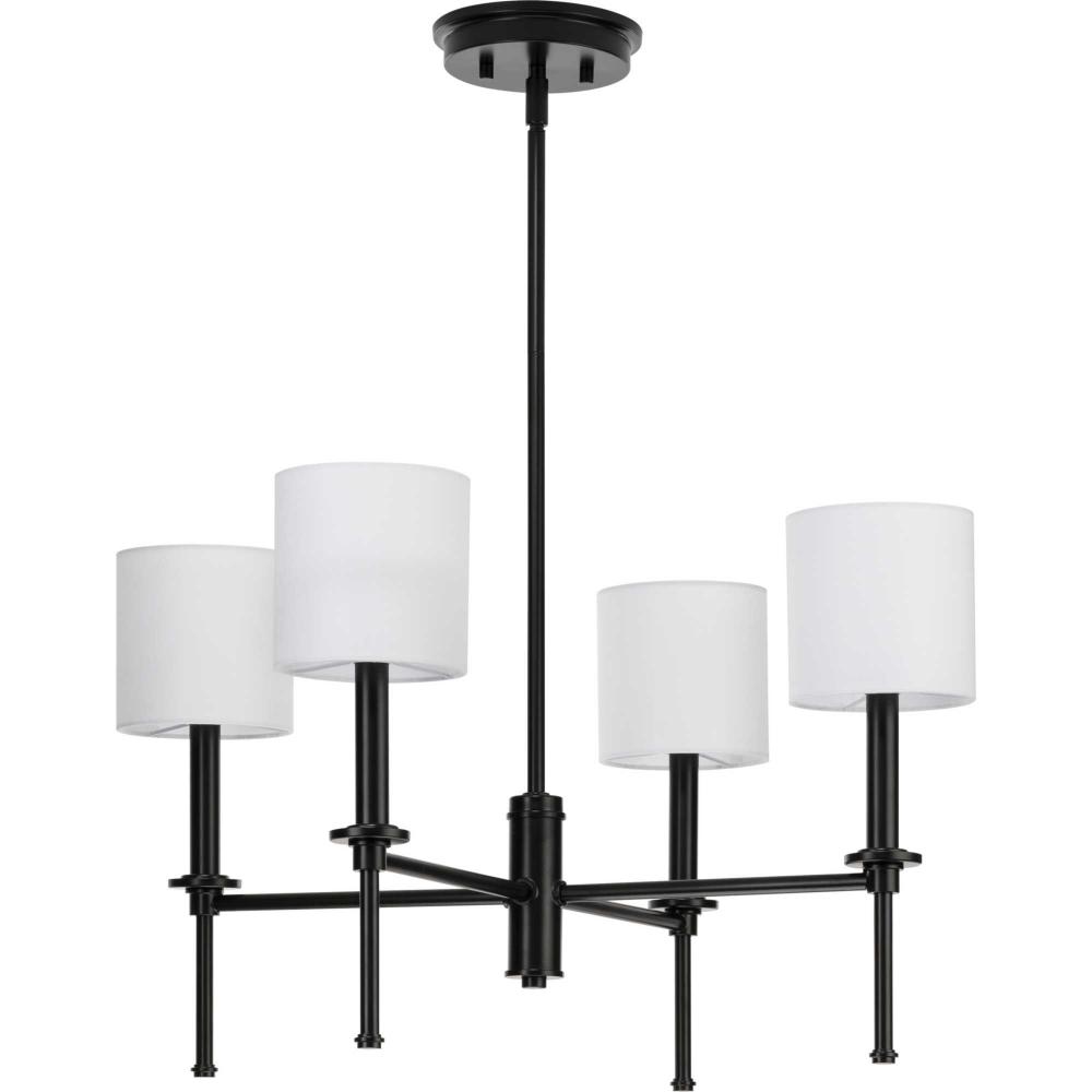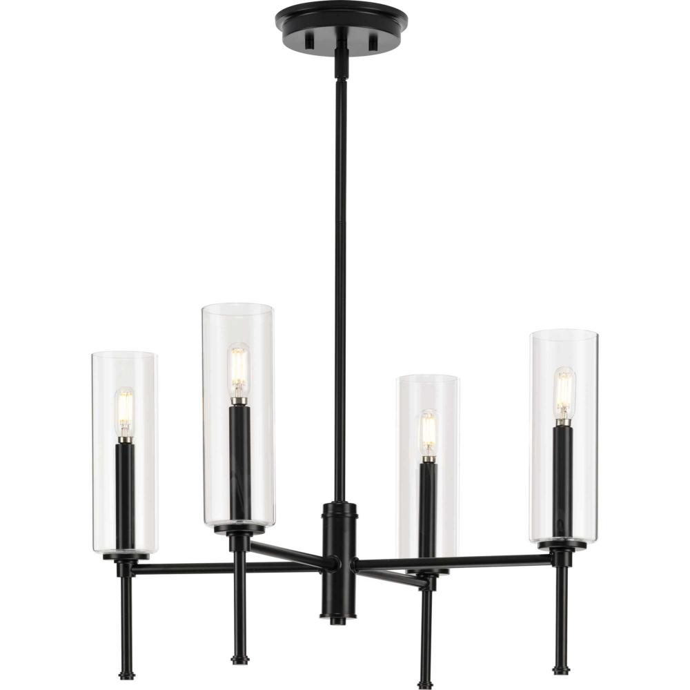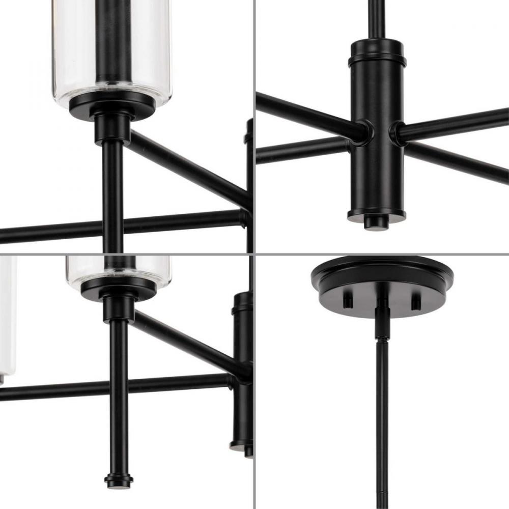Elara has a clean contemporary design that works across many decor styles. The chandelier features a slender, chic form with stylized finials inspired by a chess pawn for a classically modern look. Select tapered or fabric drum shades, or clear cylindrical glass shades to customize the design and create the perfect amount of even illumination.