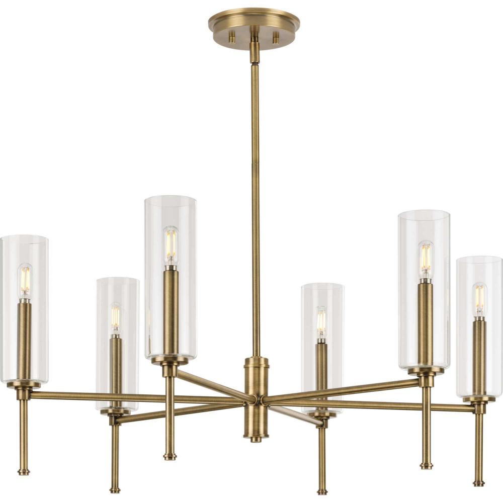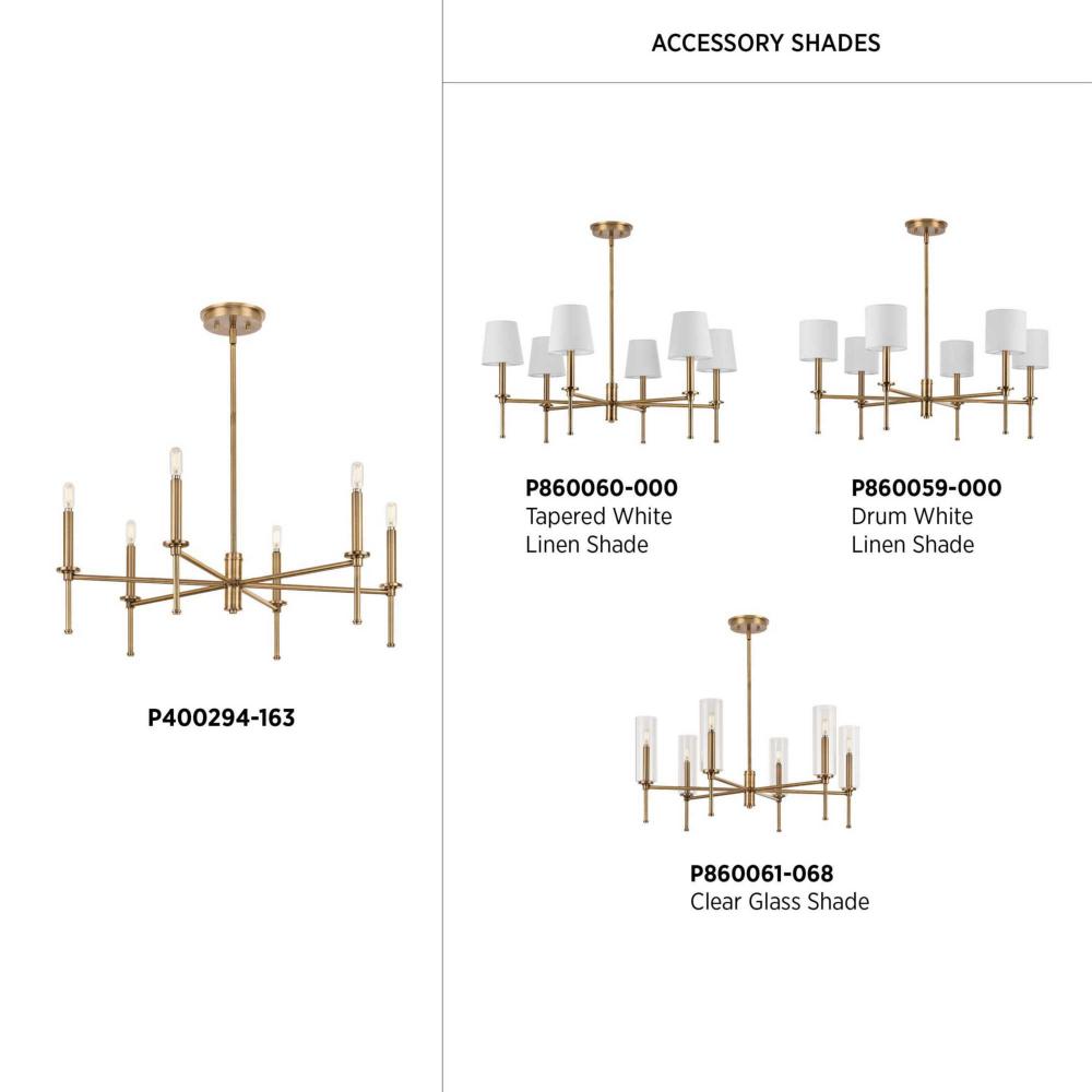 Elara has a clean contemporary design that works across many decor styles. The chandelier features a slender, chic form with stylized finials inspired by a chess pawn for a classically modern look. Select tapered or fabric drum shades, or clear cylindrical glass shades to customize the design and create the perfect amount of even illumination.