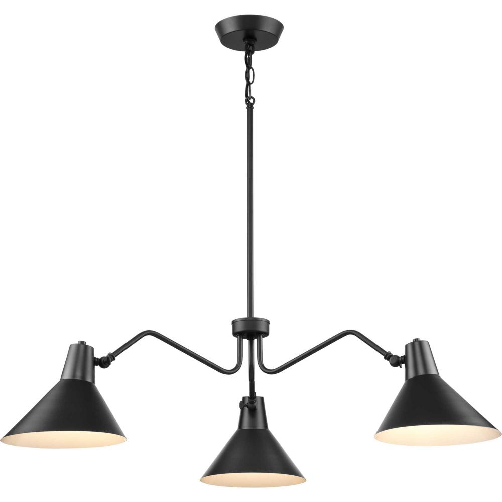 Angular metal shades suspended from an expansive frame create a signature design statement in the Trimble Collection. Its mid-century modern inspiration incorporates a streamlined approach and rich visual details that bring iconic style to open spaces. Its opaque metal shades are finished in subtle matte black. This pendant is ideal for delivering crisp downlight to living rooms, dining rooms and bedrooms in mid-century modern and luxe industrial settings.