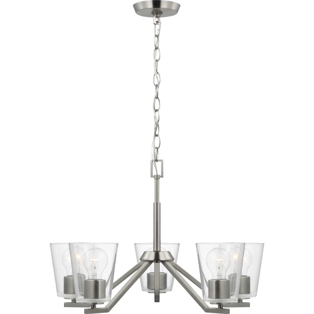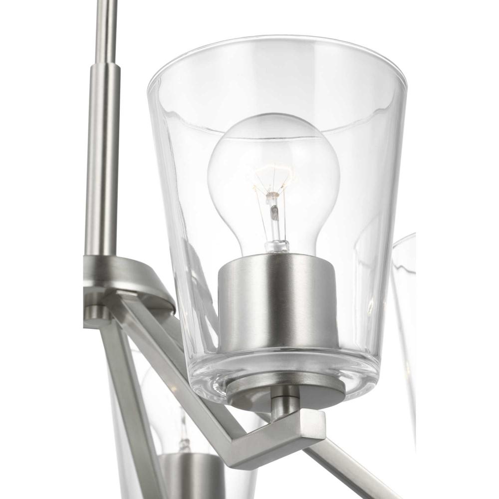 Elegantly extended, the Vertex chandelier is composed of angular forms to create a bold design that perfectly complements dining rooms and living rooms in modern interiors. Its distinctive silhouette is coated in a soft brushed nickel finish. A clear glass shade offers bright illumination to spaces below. Customize the chandelier's hanging height to your ceiling using the Included 48 in. of chain for a variety of ceiling heights and sloped ceilings.