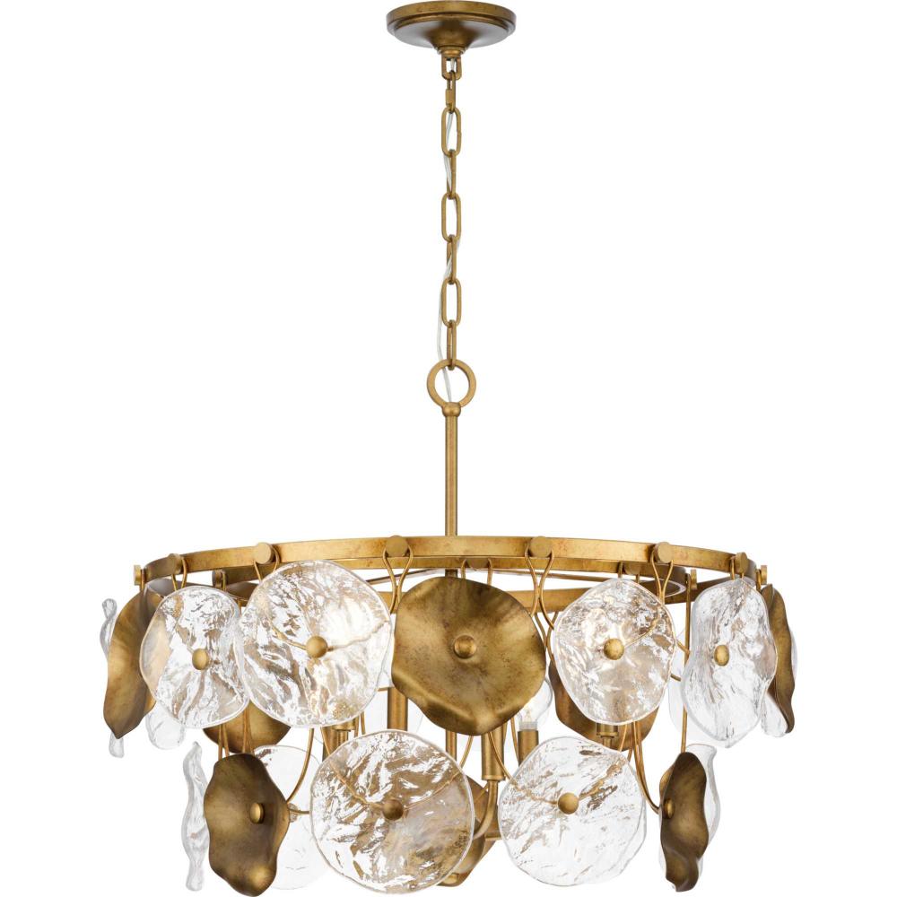 The Loretta Collection captures the serene feel of lily pads floating in a gently rippling pond. Glimmering artisanal clear glass is paired with handcrafted metal leaves finished in a soft, Gold Ombre patina.Light sources deliver an ambient glow behind the luxe glass and metallic discs that festoon its graceful frame. This fixture is part of the Progress Lighting Design Series, a lighting collection offering fashionable styles and affordable luxury lighting for the home.