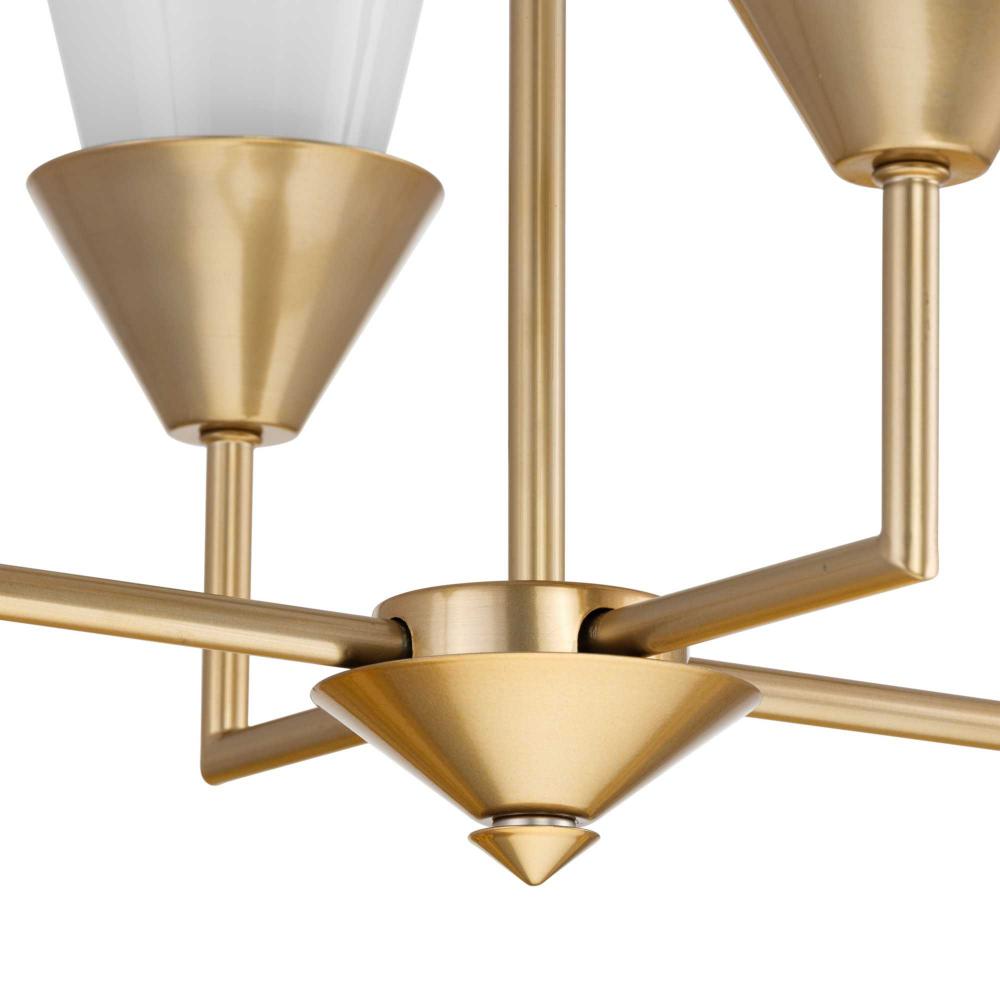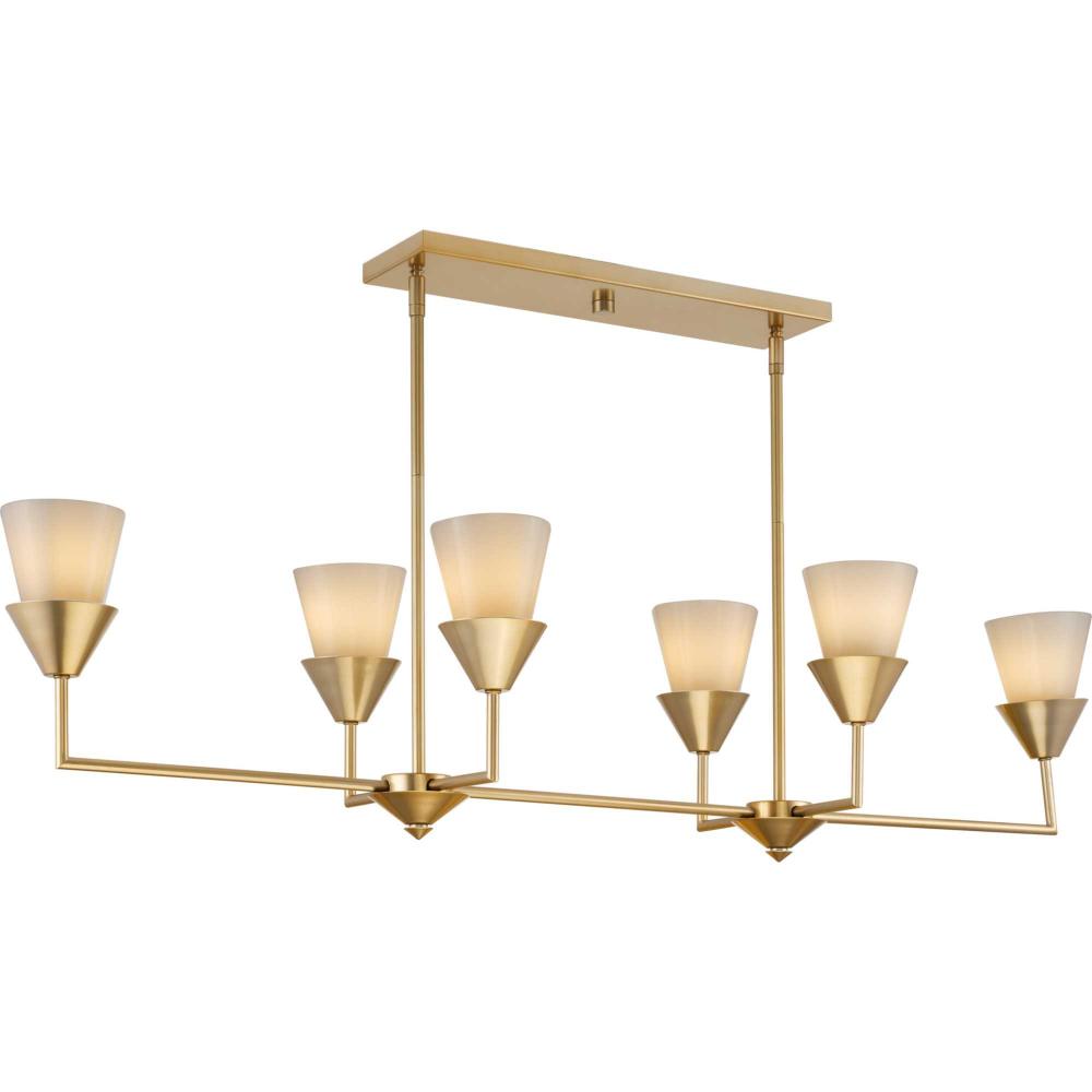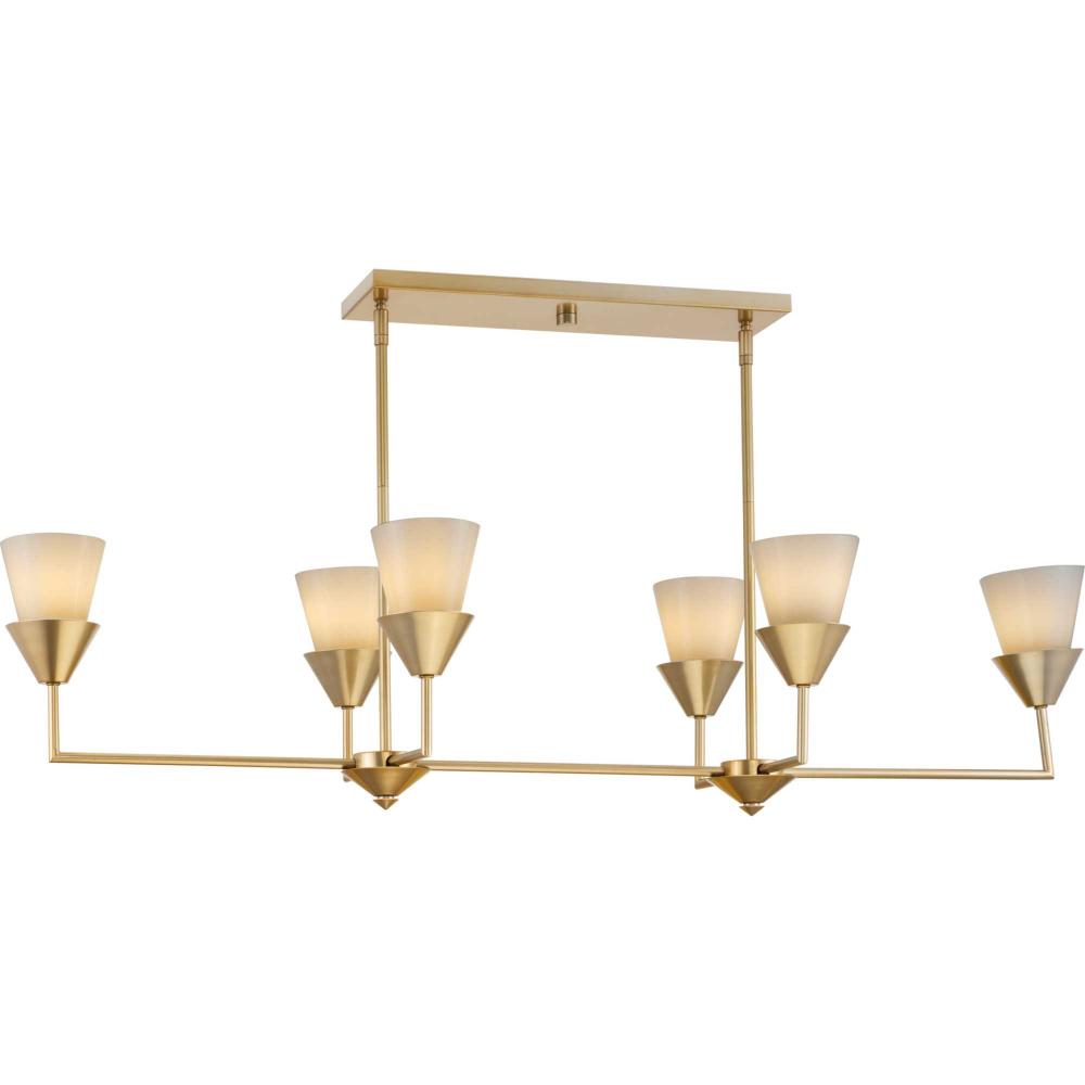 The Pinellas Linear Chandelier gets to the point with a modern expression of a timeless form. The signature dual conical motif has the elements artfully nested together to provide a pleasing diffusion of light from its opal glass shades. This fixture is part of the Progress Lighting Design Series, a lighting collection offering fashionable styles and affordable luxury lighting for the home.