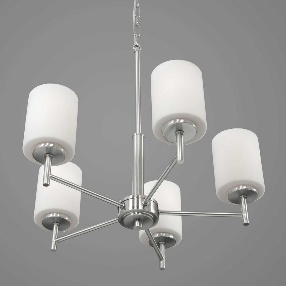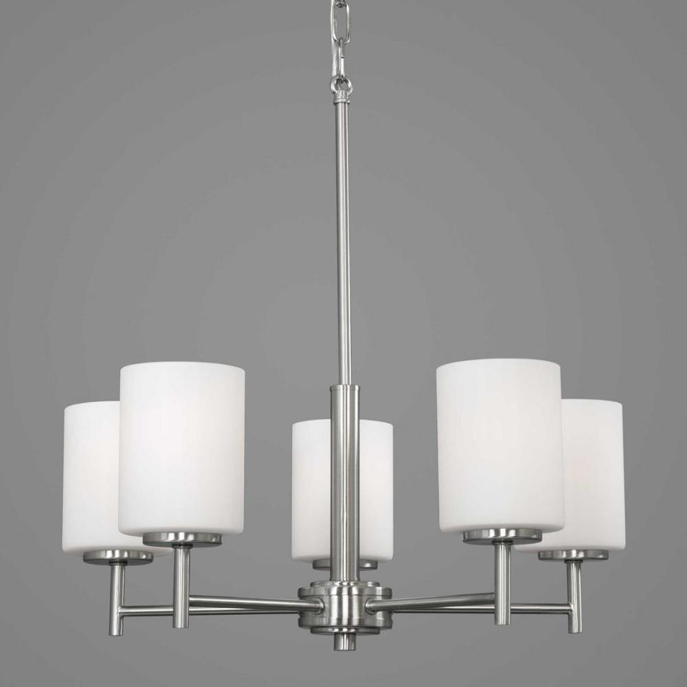 Five-light chandelier from the Replay Collection features a linear form that provides a pleasingly elegant accent to your home. A sleek, metallic finish is complemented by white glass diffusers for a clean, modern silhouette. Brushed Nickel finish.