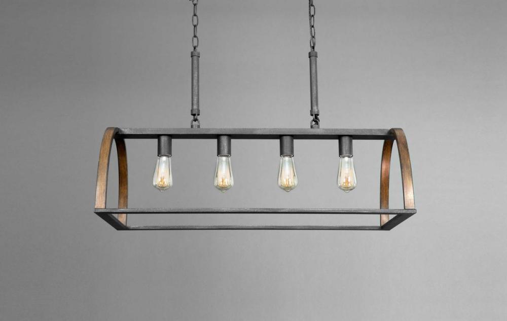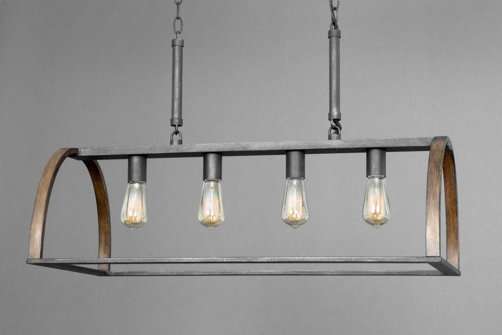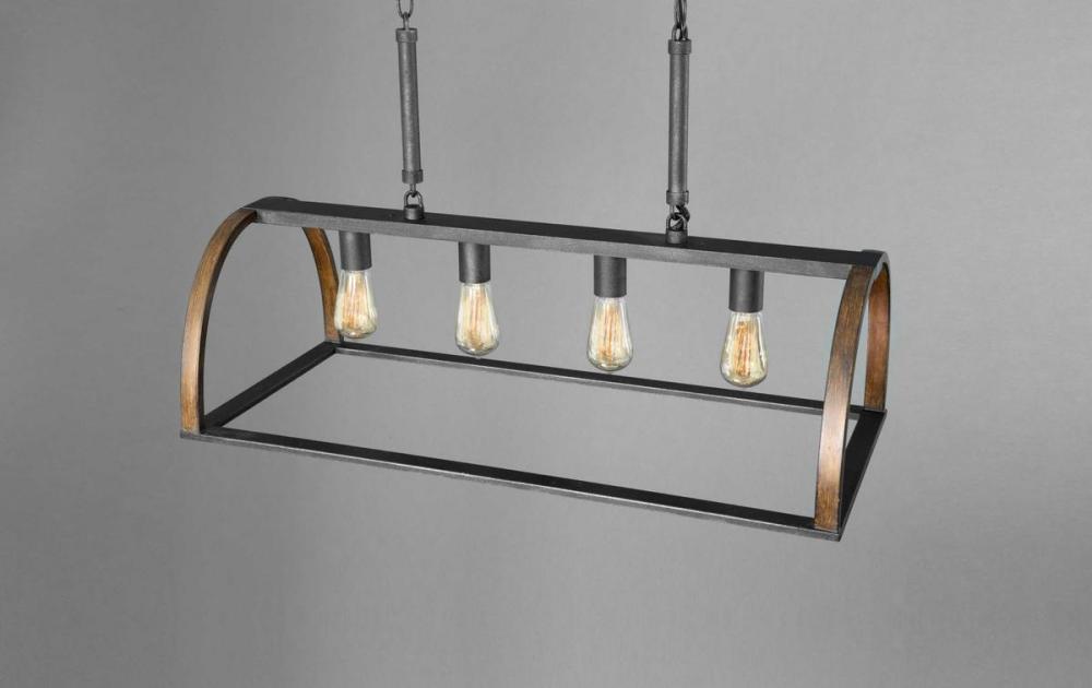Fixtures within the Trestle collection offer a handsome look for industrial or rustic living spaces. Featuring a hand painted cage with geometric elements, pendant and linear options can revive a look over kitchen island or bar, as well as dining and living spaces. The Gilded Iron finish is enhanced by hand-painted oak accent. Four-light island light.