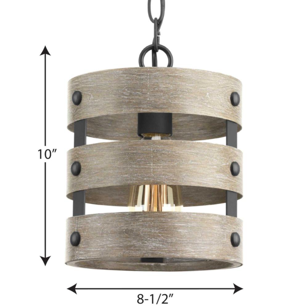 Three circular bands wrap together to create an open design in Gulliver. Hand painted to emulate weathered driftwood, the one-light mini-pendant's Graphite frame is accented by smooth knobs and encases exposed bulbs. The wood grained texture complements rustic farmhouse home decor.