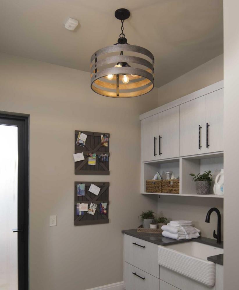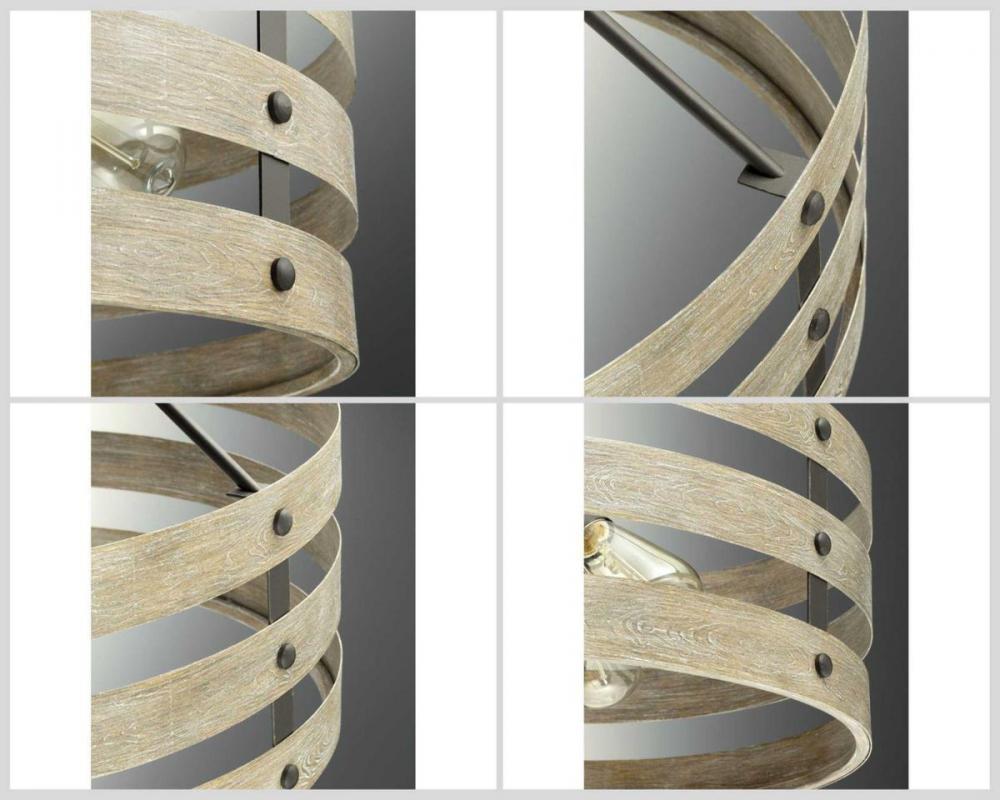 Three circular bands wrap together to create an open design in Gulliver four-light pendant. A hand painted wood grained texture complements Rustic and Modern Farmhouse home decor, as well as Urban Industrial and Coastal interior settings.