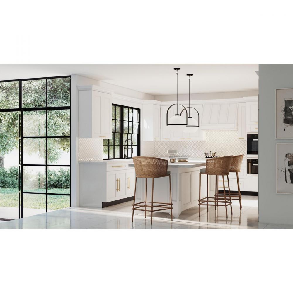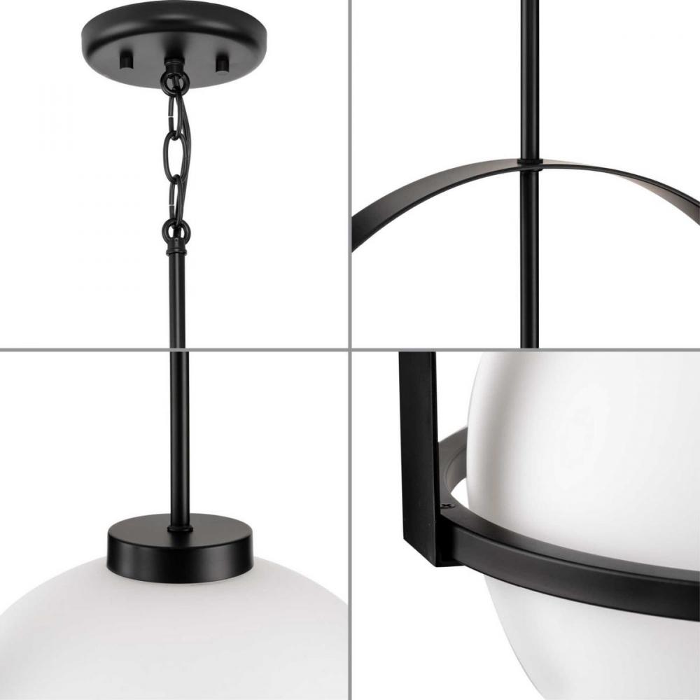 Delayne has a sophisticated style that transcends its simple design. A softly curved fitted metal framework encases an opal glass globe with slender bands creating a dynamic form. The pendant offers a refined mid-century design enhanced by gently diffused light that creates an ambient glow.