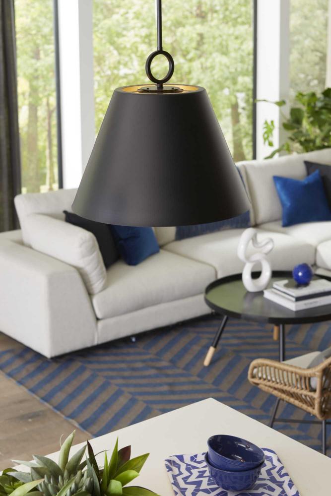 The Parkhurst pendant features a crisp dome metal shade suspended by an elegant ring. Light gleams softly from within the gold-finished interior, casting a soft glow on the surfaces below. This substantial pendant has warmth and depth and is ideal for new traditional, modern farmhouse, and transitional interiors.
