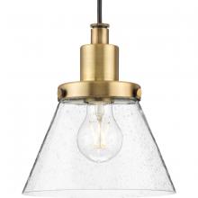 The pendant's metal fittings and cone shaped seeded glass shade creates a stately accent to modern themes