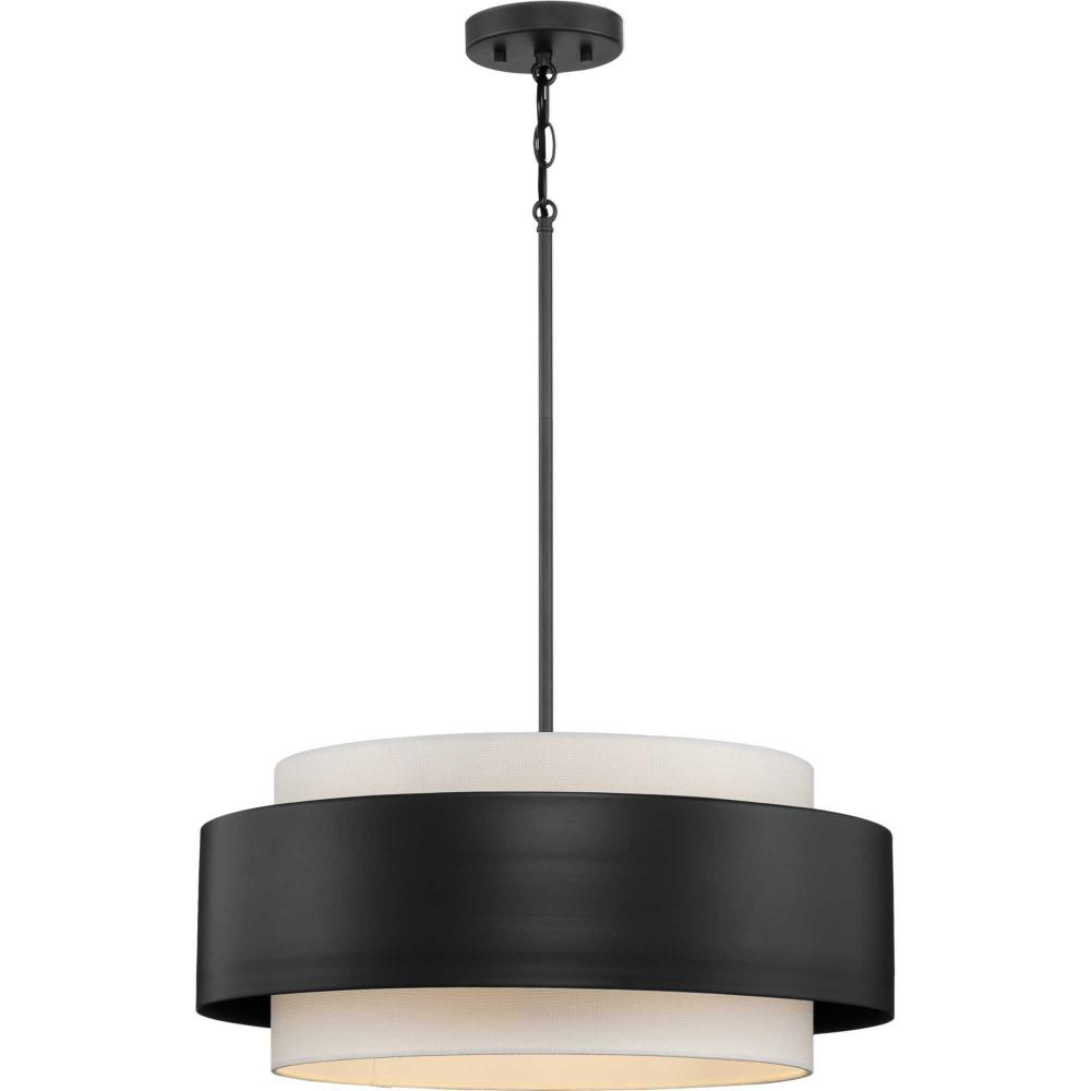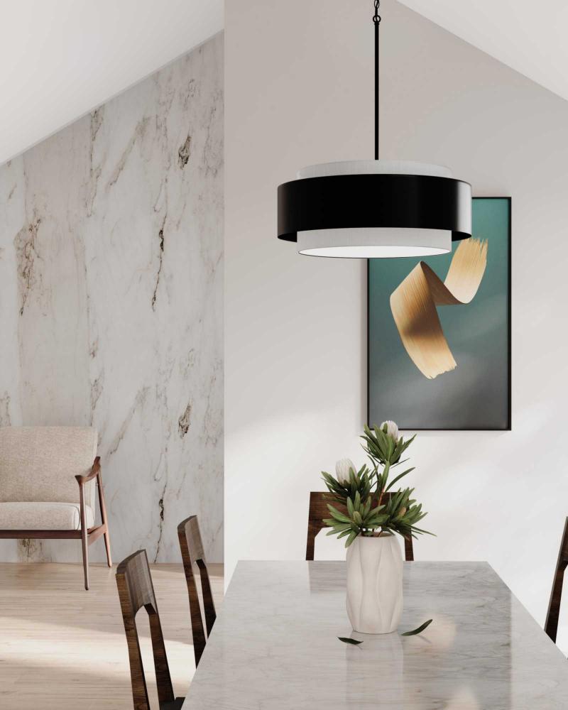 Focused down light is cast to surfaces below while soft ambient light is delivered through the fabric shade