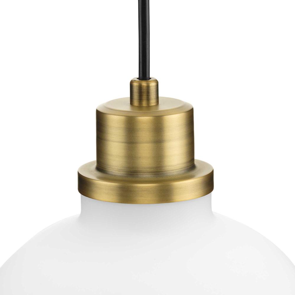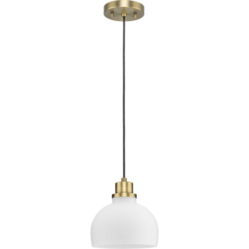 The pendant features a round etched glass shade with a metal cap and canopy finished in vintage brass