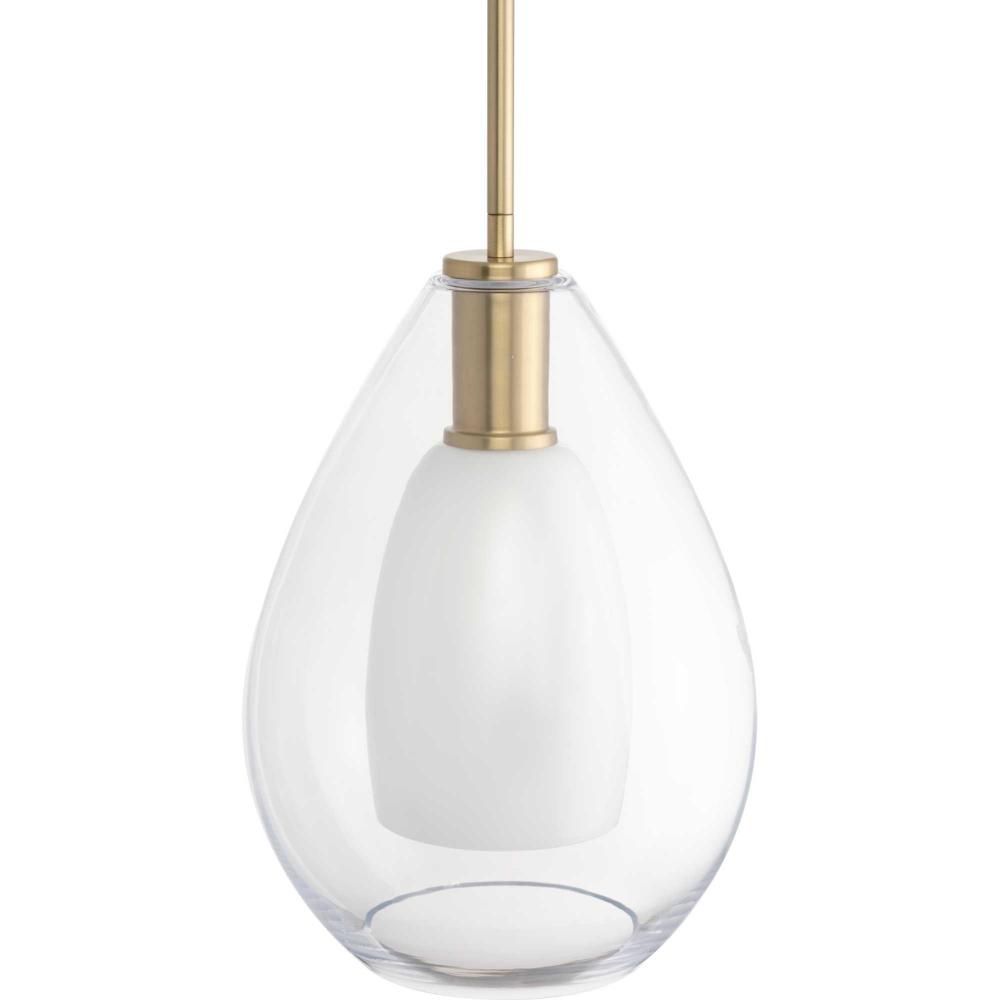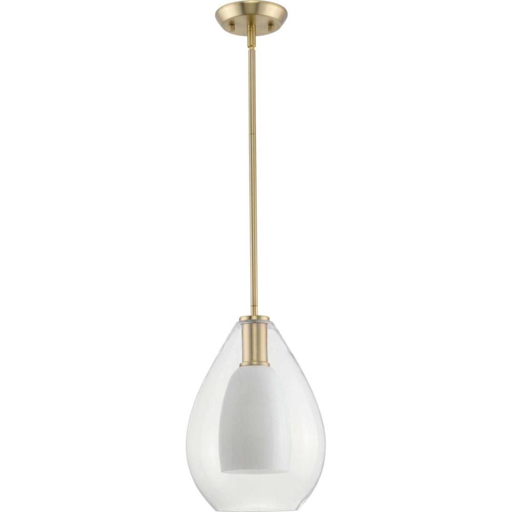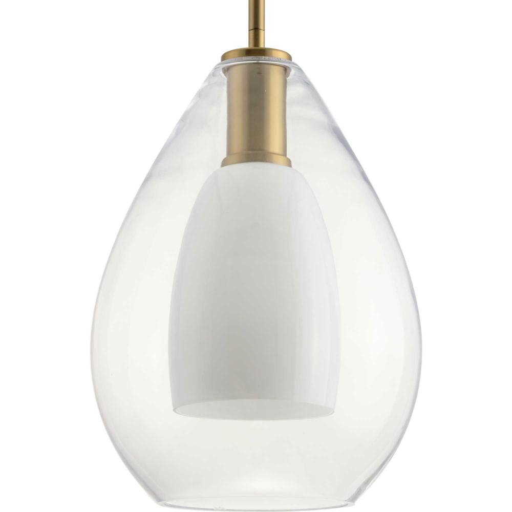 The Carillon Pendant commands attention with its impressive scale and gleaming surface. An impressive clear bell-shaped glass shade surrounds a white opal diffuser suspended by hardware finished in soft Brushed Gold, creating a warm and inviting ambiance.This versatile pendant is slope ceiling adaptable and stem hung with several lengths of stem included, allowing for easy customization for your home's ceiling requirements.