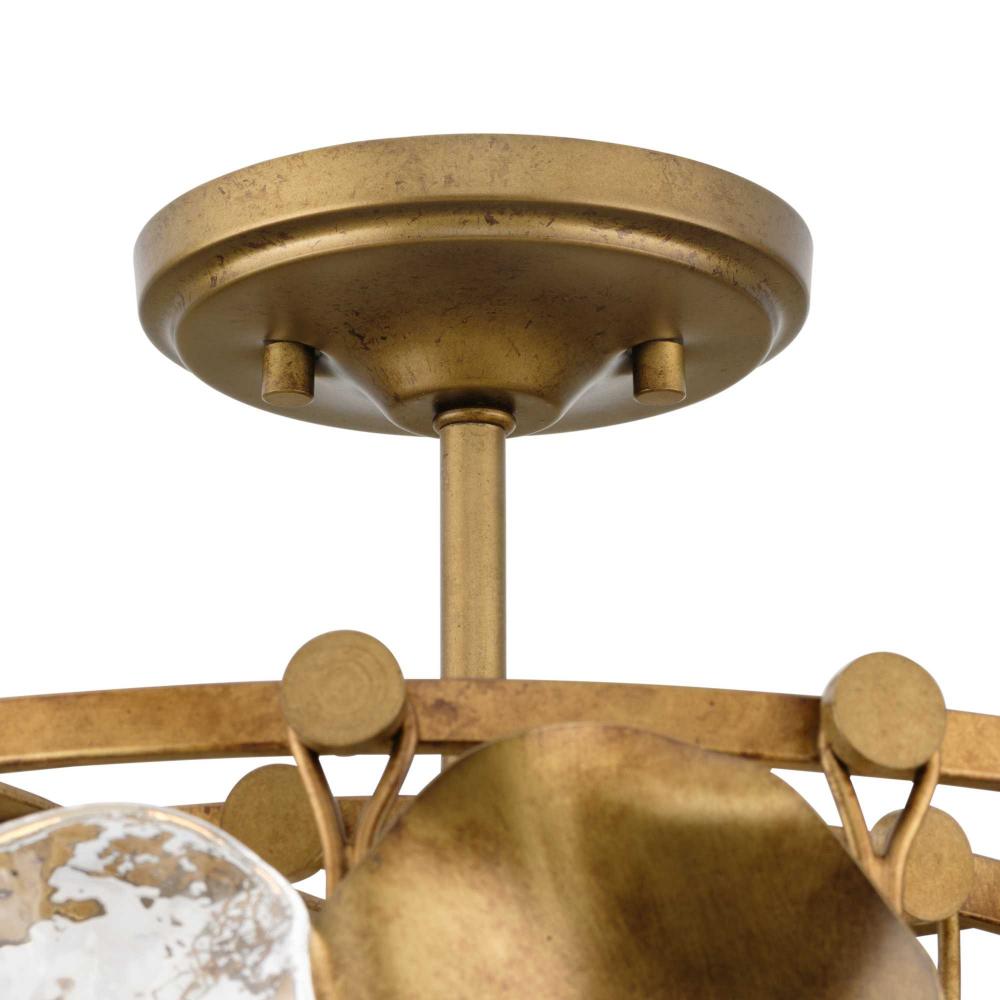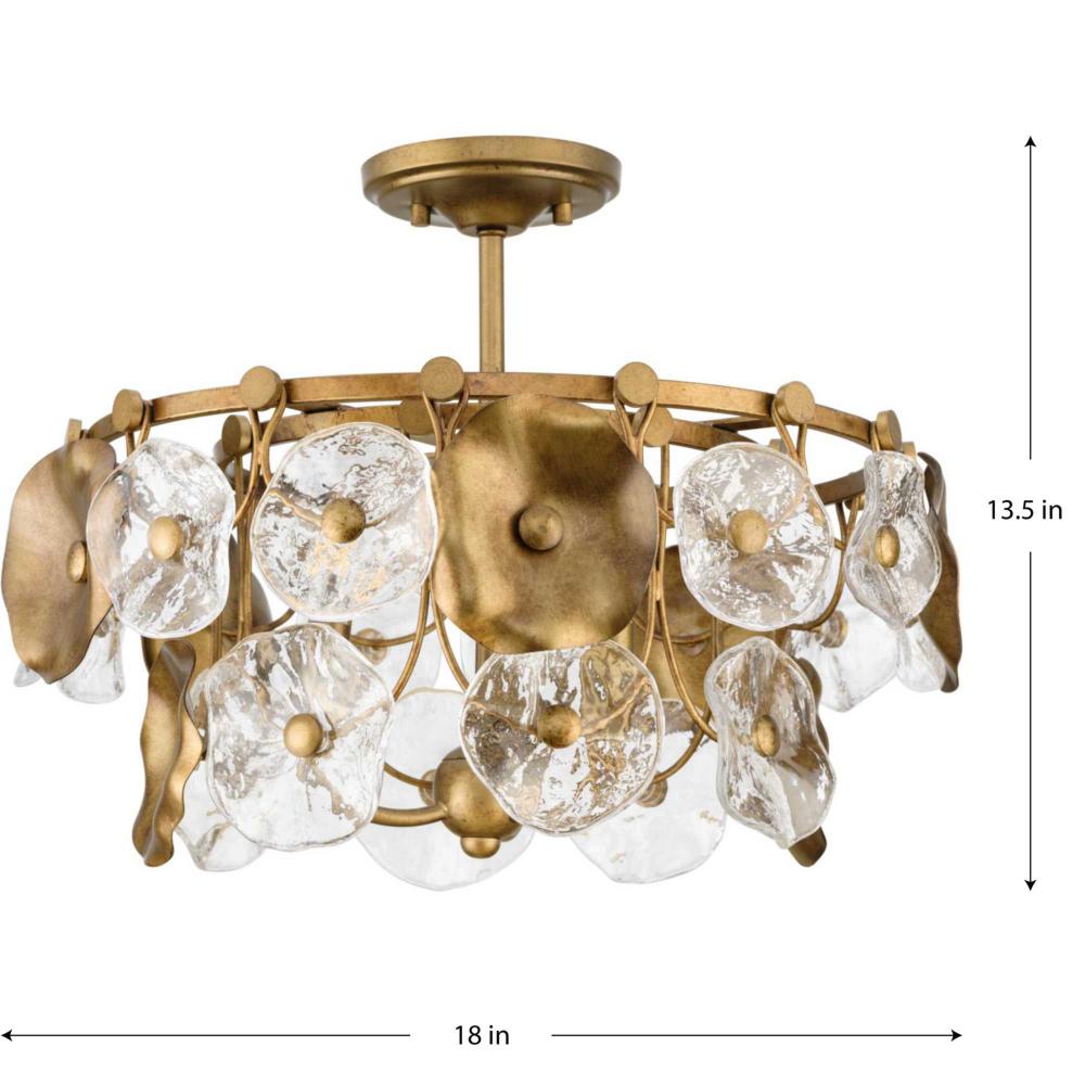 The Loretta Collection captures the serene feel of lily pads floating in a gently rippling pond. Glimmering artisanal clear glass is paired with handcrafted metal leaves finished in a soft, Gold Ombre patina.Light sources deliver an ambient glow behind the luxe glass and metallic discs that festoon its graceful frame. This fixture is part of the Progress Lighting Design Series, a lighting collection offering fashionable styles and affordable luxury lighting for the home.