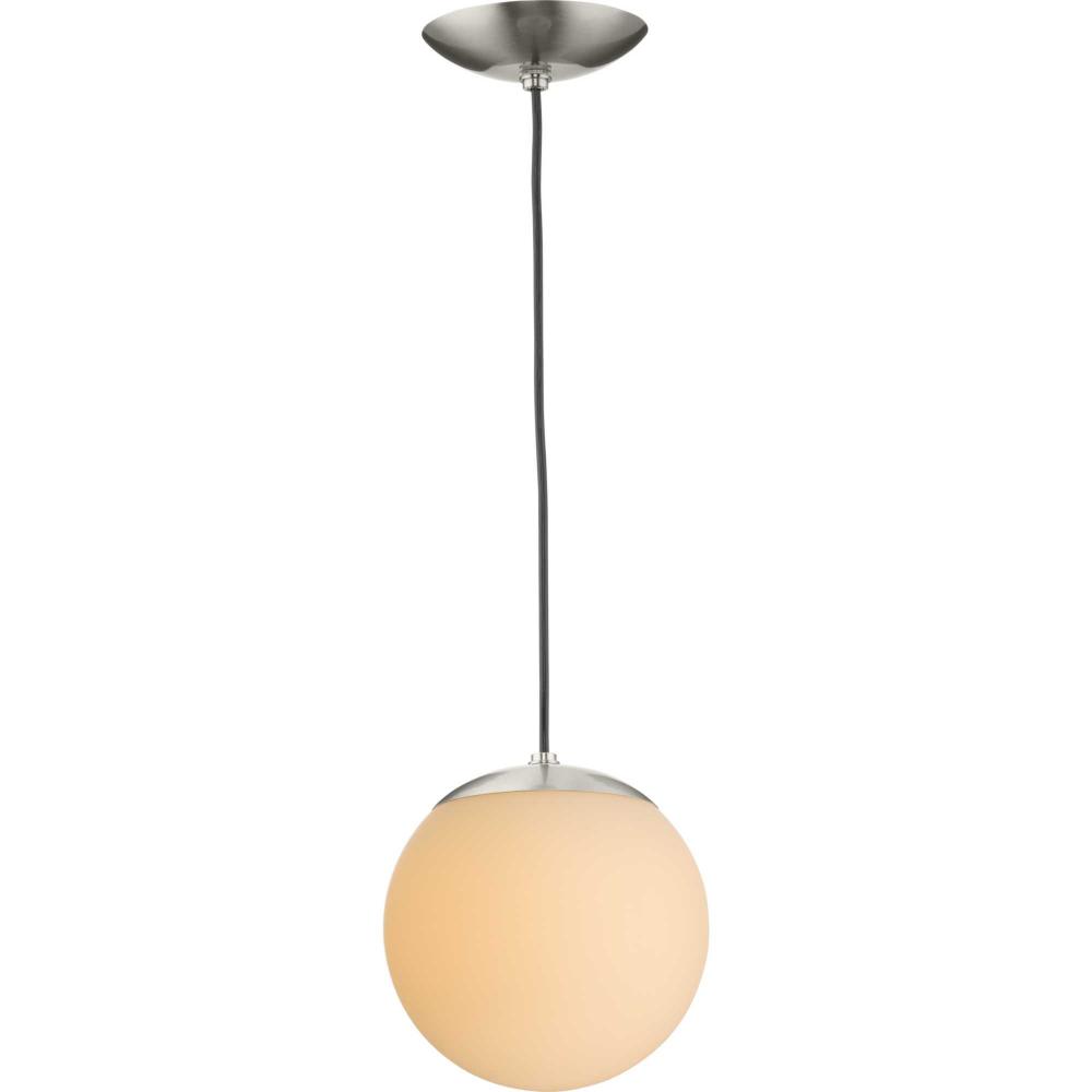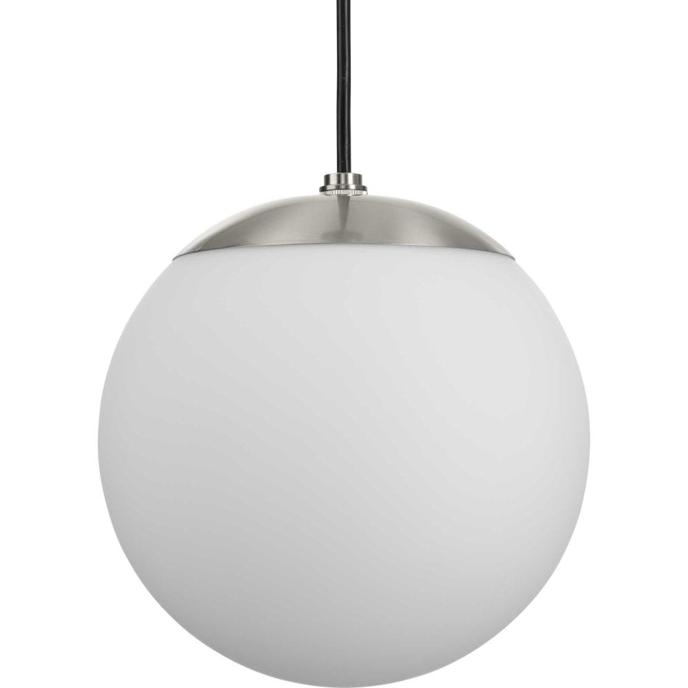Embrace a statement-making lighting design with the Atwell Pendant Light. A light source glows from within an opal glass globe shade, fostering a soft and enduring design. The metal cap and light base are coated in a beautiful brushed nickel finish that accentuates the design's modern aesthetic. The light hangs from a flexible black cord that can be adjusted for height to meet your unique design needs.