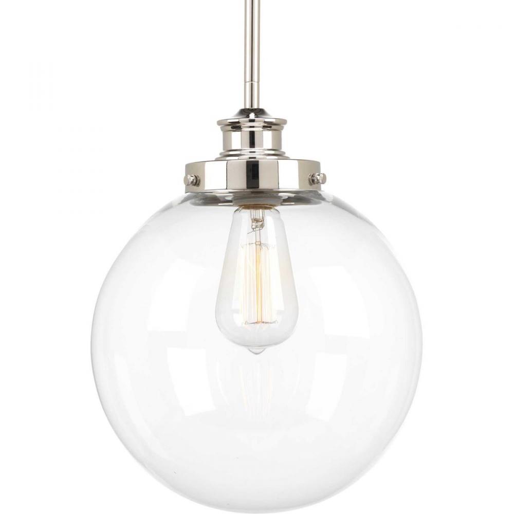 The one-light pendant in the Penn Collection is a modern take on vintage electric design, perfect for a wide variety of styles including transitional, farmhouse and coastal. The clear glass globe is accented by beautiful polished nickel accents. These light fixtures are perfect choice for task lighting over countertops, tables, kitchen islands or bathroom sinsk. Pendant light fixtures are extremely popular as task lights in different working areas and make the area more attractive. They can be hung in multiples, trios, a pair, or hang solely by themselves.