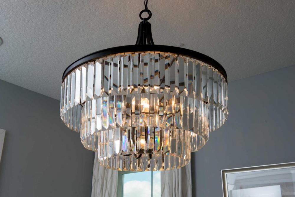 Glimmer fits the definition of livable luxury with elements that sparkle to create an instant statement within the home. Prismatic glass Prismatic glass six-light round pendant is supported by an architecturally- styled frame in Antique Bronze finish. The cascade of faceted linear glass deliver a sleek silhouette to any room.