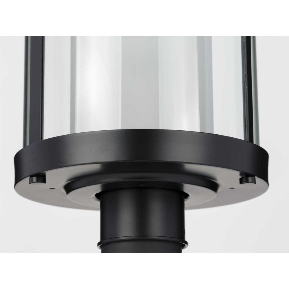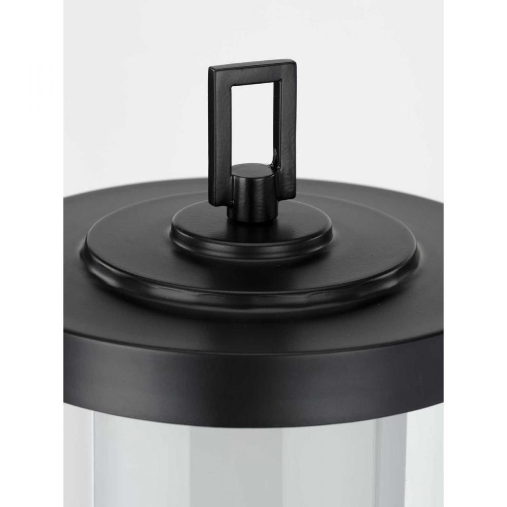 Matte black frame features a decorative rectangular design on its top.;A clear glass shade holds an etched glass diffuser ready to provide a lovely ambient glow.;Modern light fixture with an industrial flair.;Ideal for any outdoor space in need of illumina