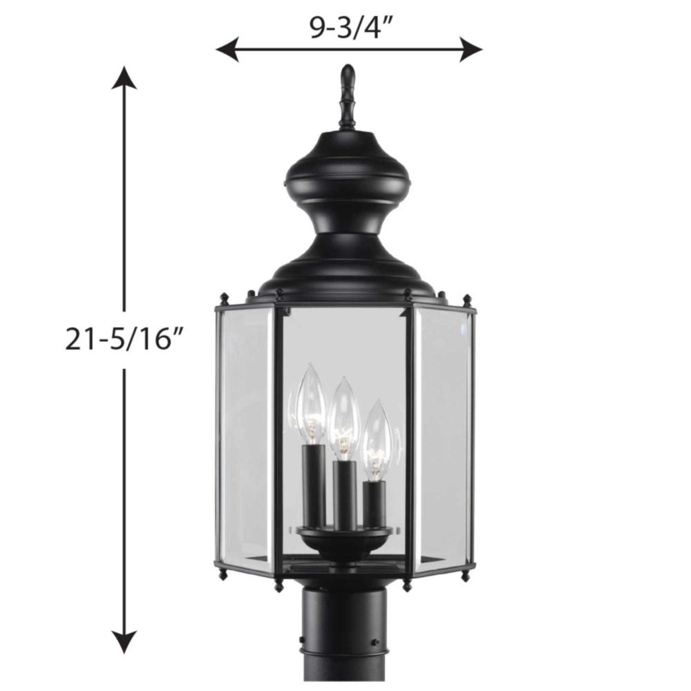 Traditional hexagonal style post lantern with clear beveled glass panels. Fits on 3" post. Solid brass construction with protective finish coat. Black finish.