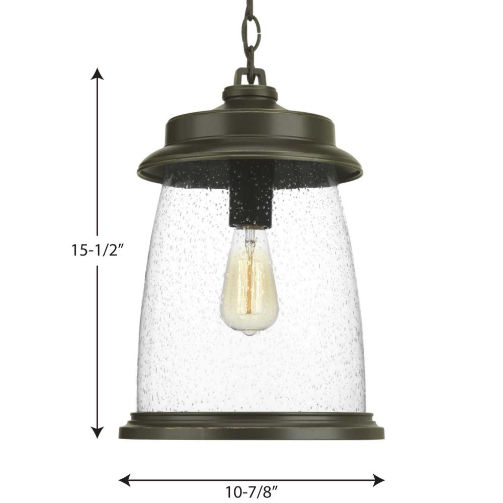 Conover is an outdoor lantern collection featuring nautical influences. A protective die cast ring surrounds beautiful clear seeded glass. Vintage metallic finishes are available for this collection that is sure to enhance curb appeal for a variety of exteriors. Hanging Lantern in a Antique Bronze finish.