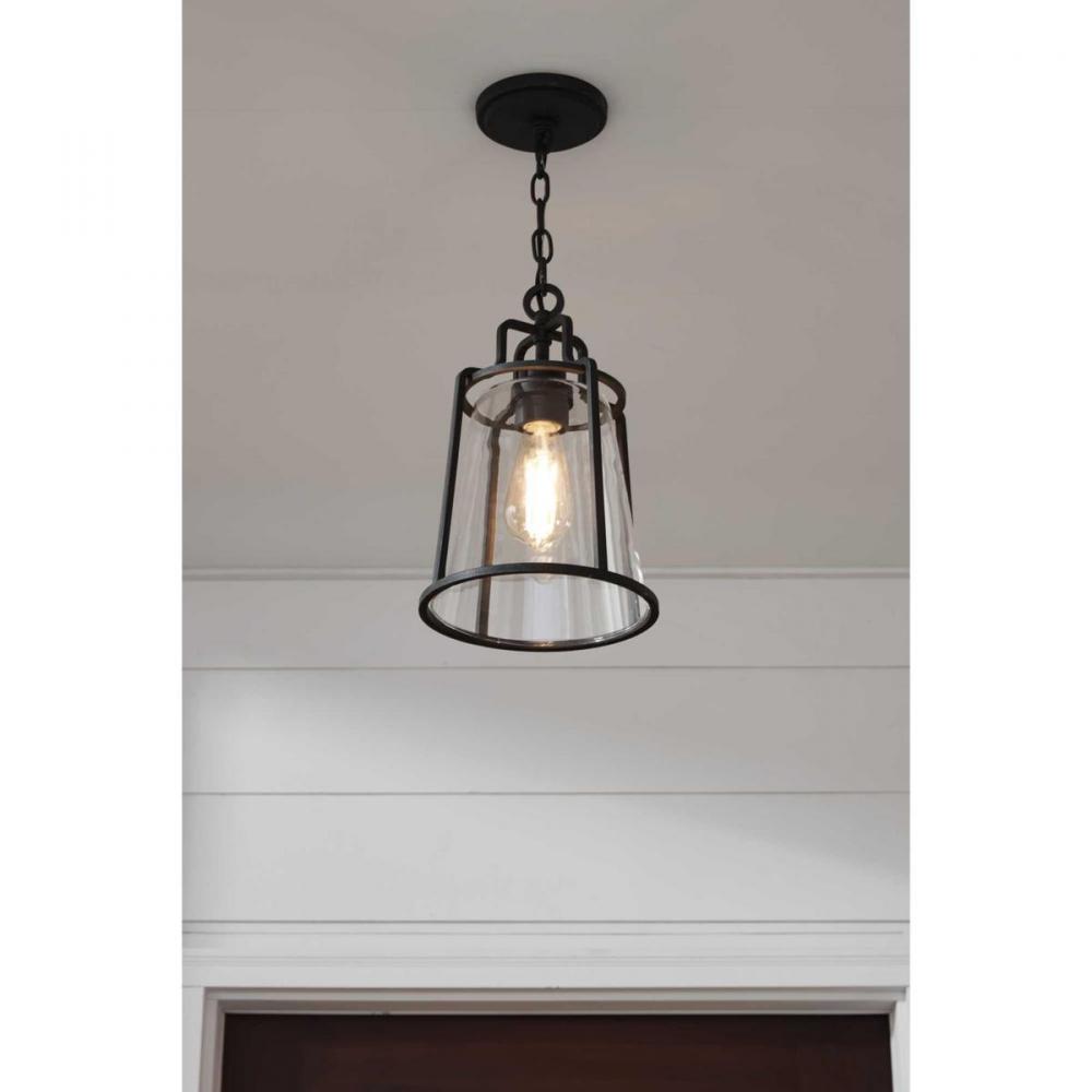 A clear glass shade shields a simple light base for a seaside-living vibe.;The glass shade is cradled inside an open-cage black frame of corrosion-proof composit polymer.;The hanging lantern is expertly crafted with a non-metallic, corrosion-resistant hous