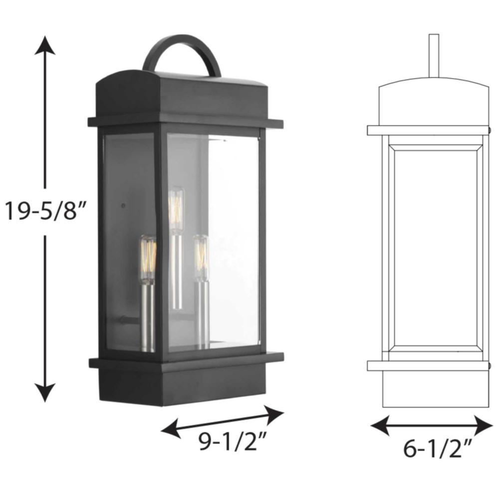 A classic three-light wall lantern with contemporary touches describes Santee. Featuring a geometric frame and graphic handle, the wider beveled glass offers more refraction - and visual interest - than typical lantern designs and an black frame with brushed nickel candle option.