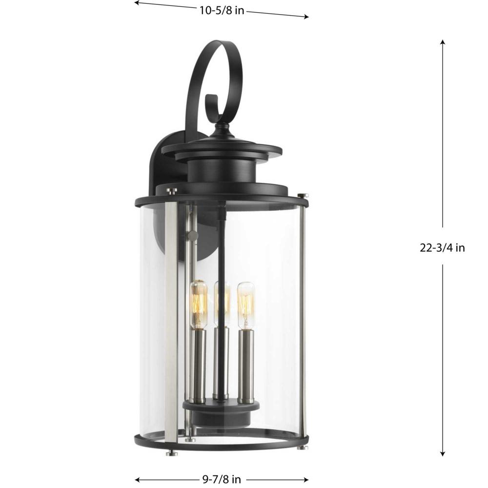 Squire three light large wall lantern features a classic traditional profile with clean, modern metal fittings. The Black finish is accented with contrasting Stainless Steel metallic elements, the cylindrical frame is comprised of a clear glass diffuser.