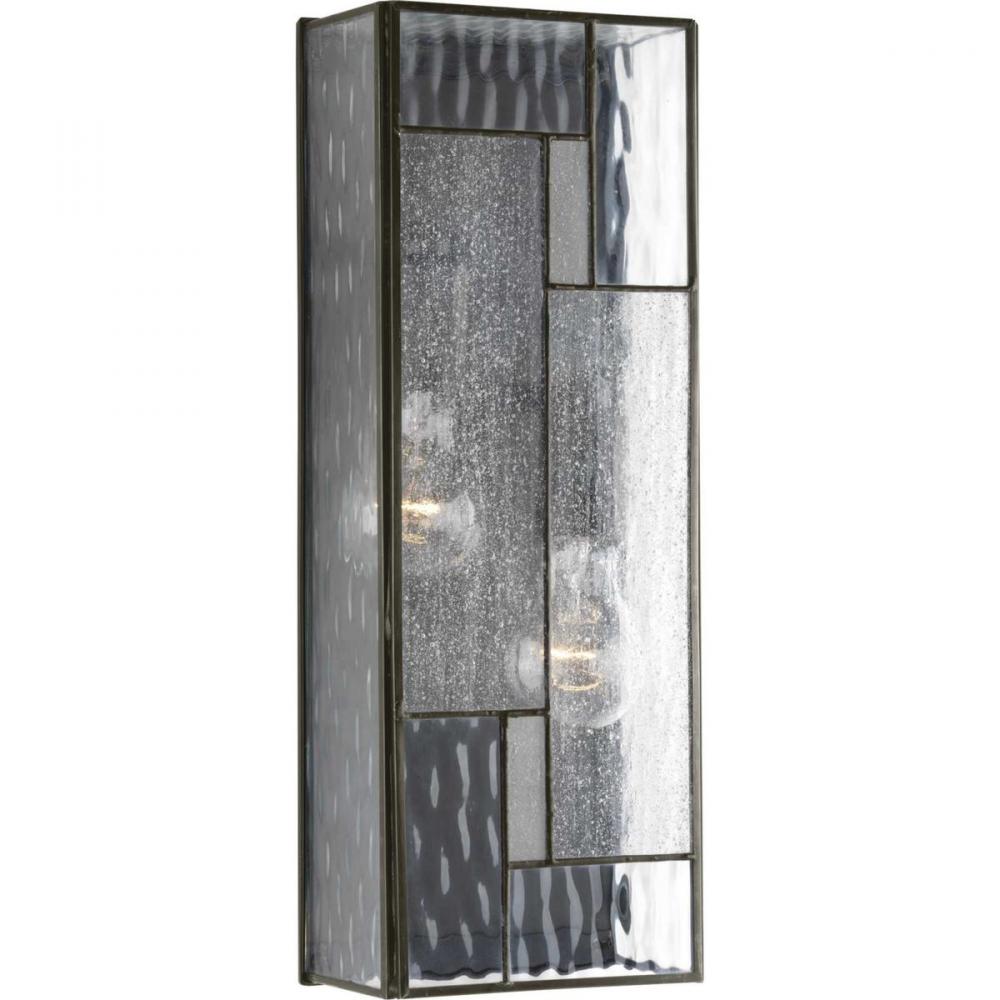 Geometric lanterns feature an artfully crafted glass enclosure with a pleasing arrangement of contrasting seeded and water glass panels. Vertical mounted only. ADA compliant.