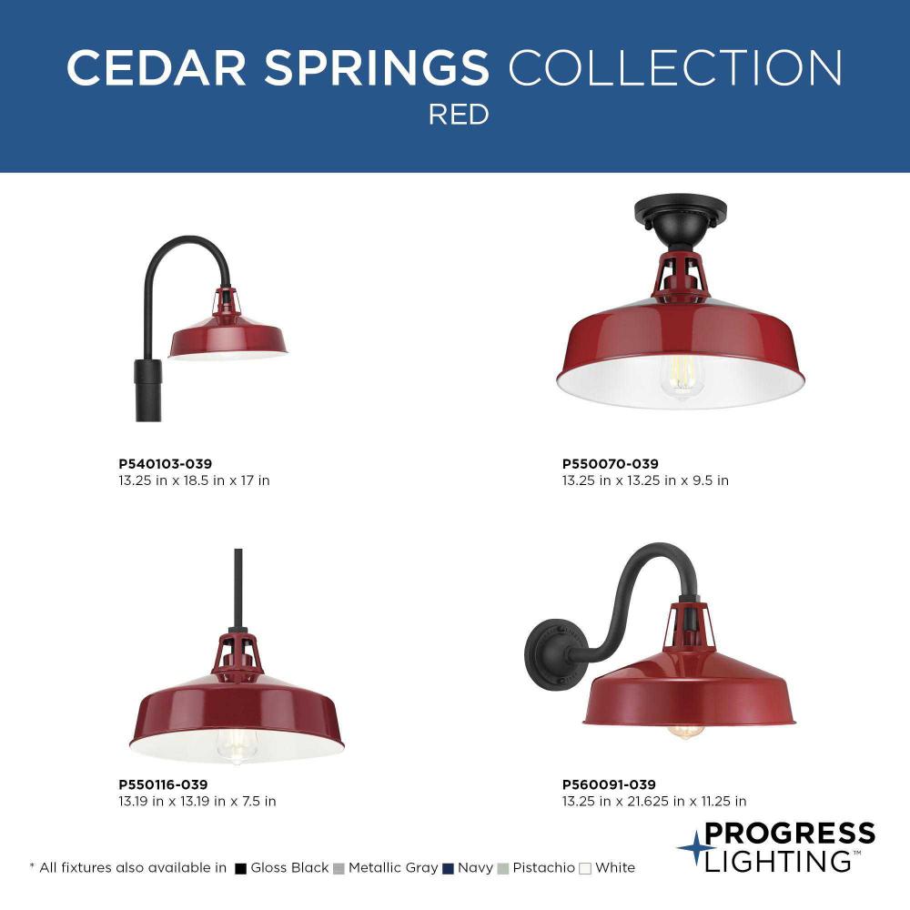 A fun take on the traditional warehouse shade, the Cedar Springs Wall Lantern can be a stylish addition to any indoor or outdoor space. Offered in a generous size and featuring a black gooseneck arm style and gloss red shade, this classic light fixture will upgrade any farmhouse or transitional style setting. Dark Sky Friendly.