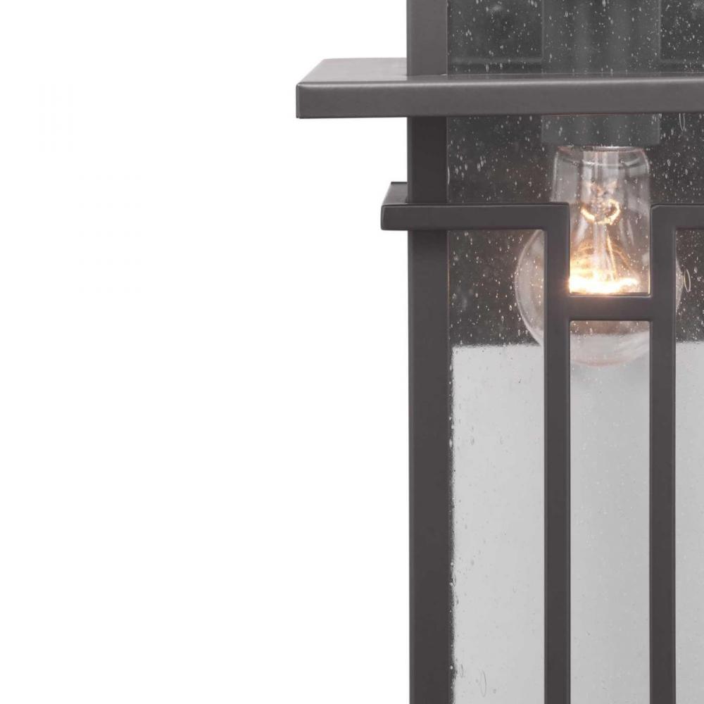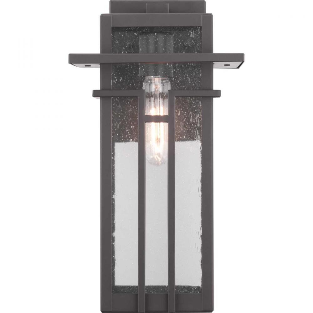 Geometric details in Boxwood’s design enhance Craftsman-inspired architecture. The one-light medium wall lantern features clear seeded glass and finished in Antique Bronze which completes the authentic style.
