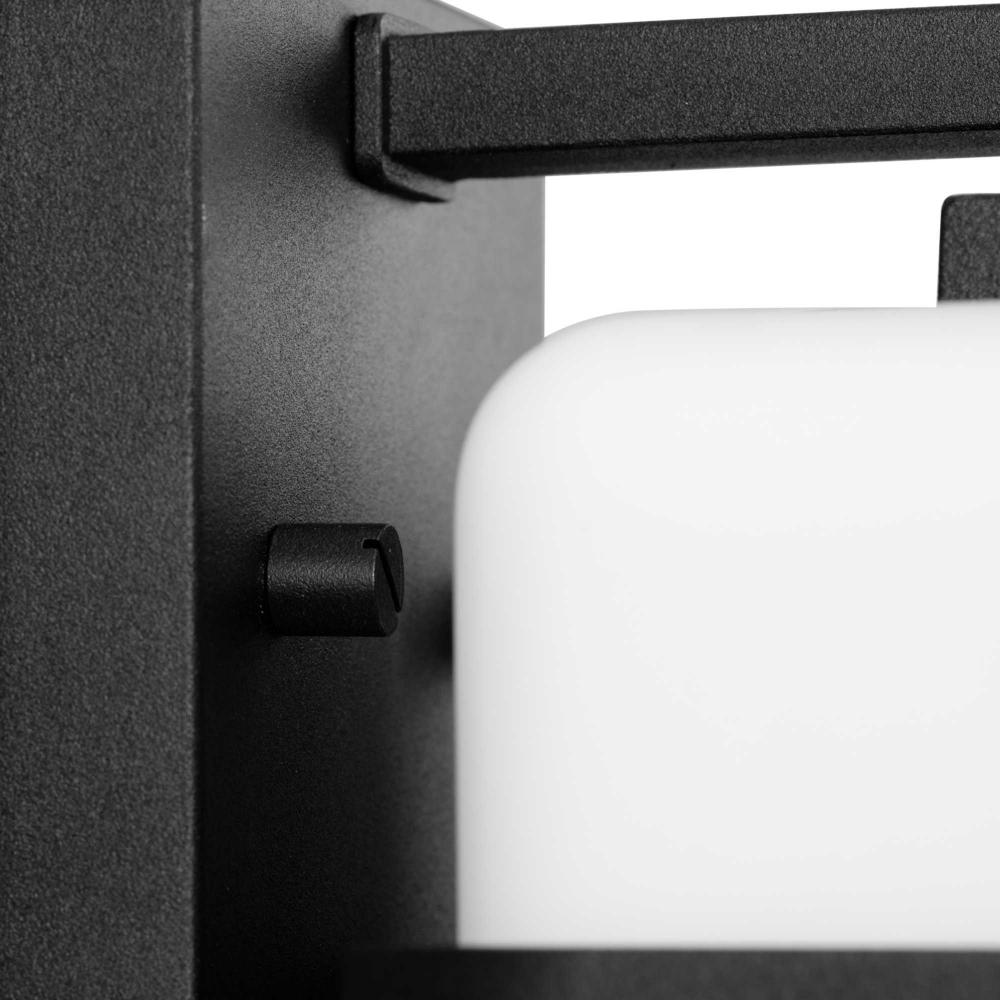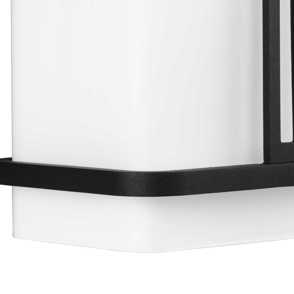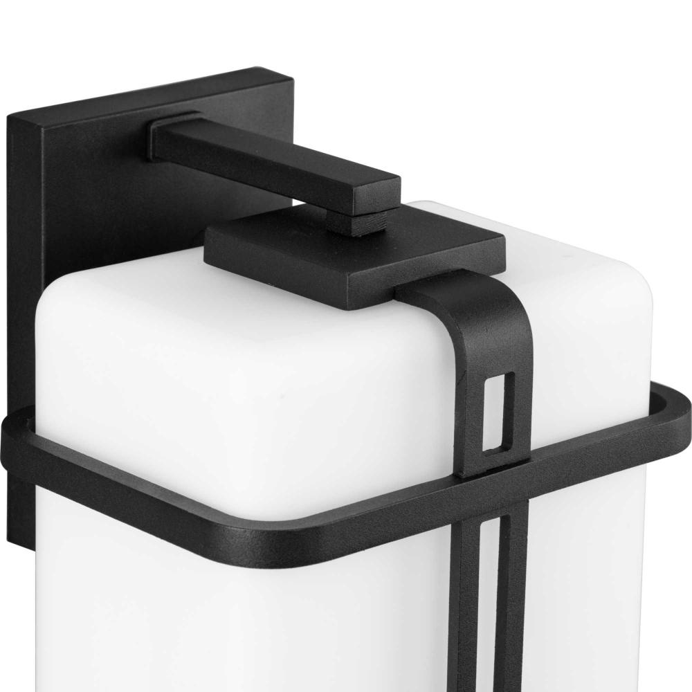 The Ellery Large Wall Lantern illuminates outdoor spaces with modern flair. A craftsman-inspired geometric frame finished in crisp black sits in sharp contrast to the generous opal glass diffuser. Slim bands converge over the shade, creating an intriguing contrast with the softly diffused light.