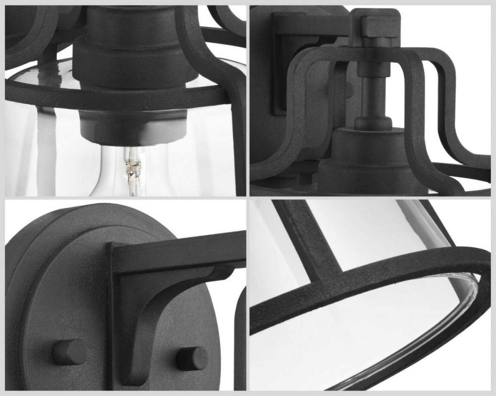 A clear glass shade shields a simple light base for a seaside-living vibe.;The glass shade is cradled inside an open-cage black frame of corrosion-proof composit polymer.;The wall lantern is constructed with a non-metallic, corrosion-resistant housing.;Ide