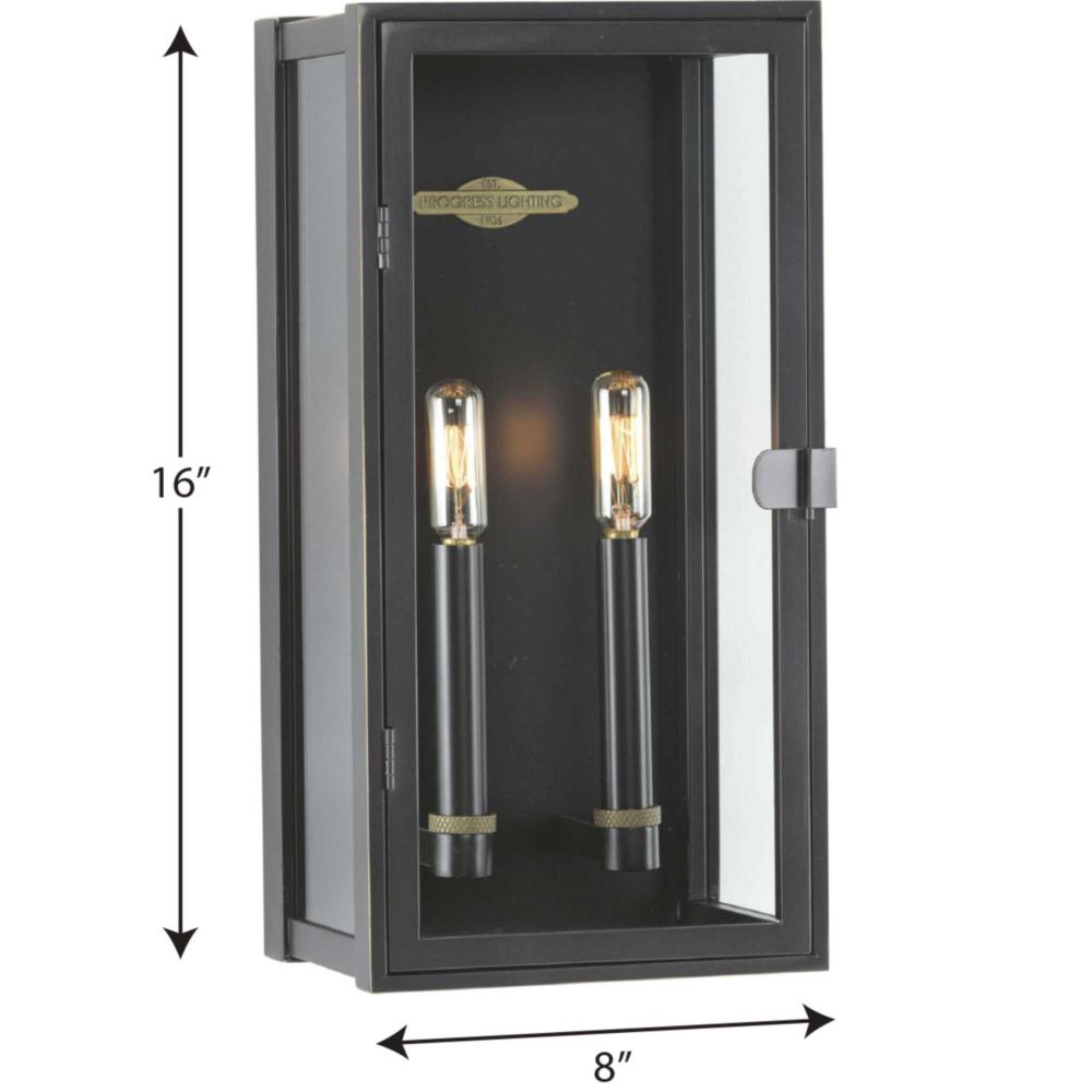 Elevate your home's curb appeal with the Stature Collection 2-Light Oil-Rubbed Bronze Clear Glass Transitional Outdoor Medium Wall Lantern Light. An elongated frame coated in an oil-rubbed bronze finish with a traditional gaslight look modernized with clear lines and complemented by brass-toned crosshatch-patterned accents for a touch of historical detailing. A clear glass door allows for bright illumination and features a recessed hinged door for ease of maintenance.